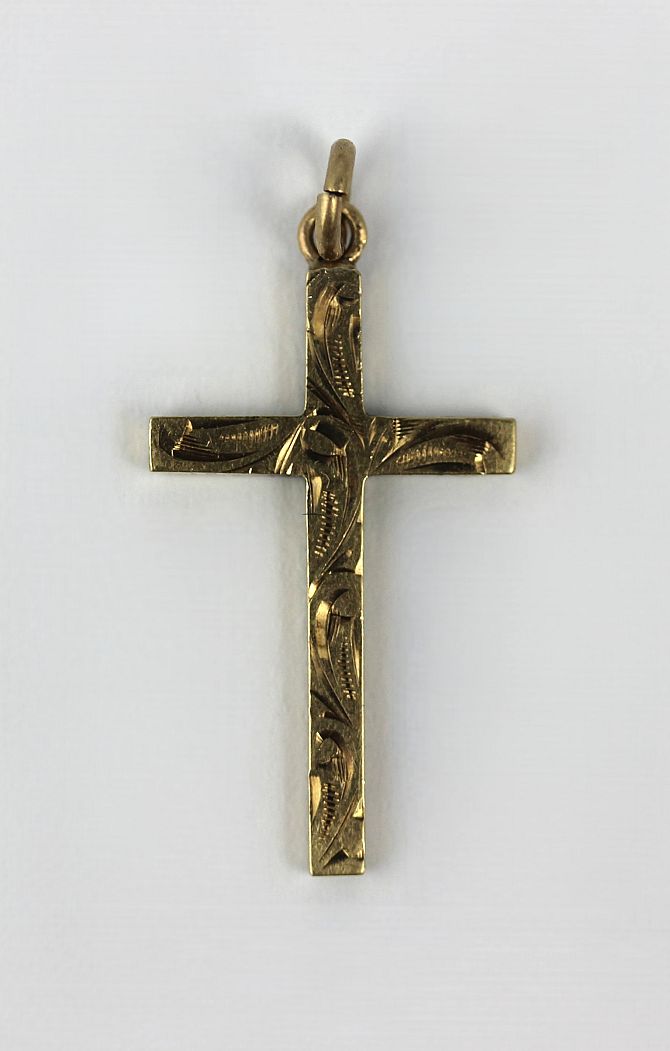 A 9ct gold pendant cross with engraved decoration, 1.3g