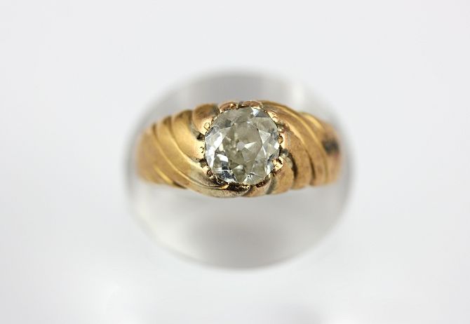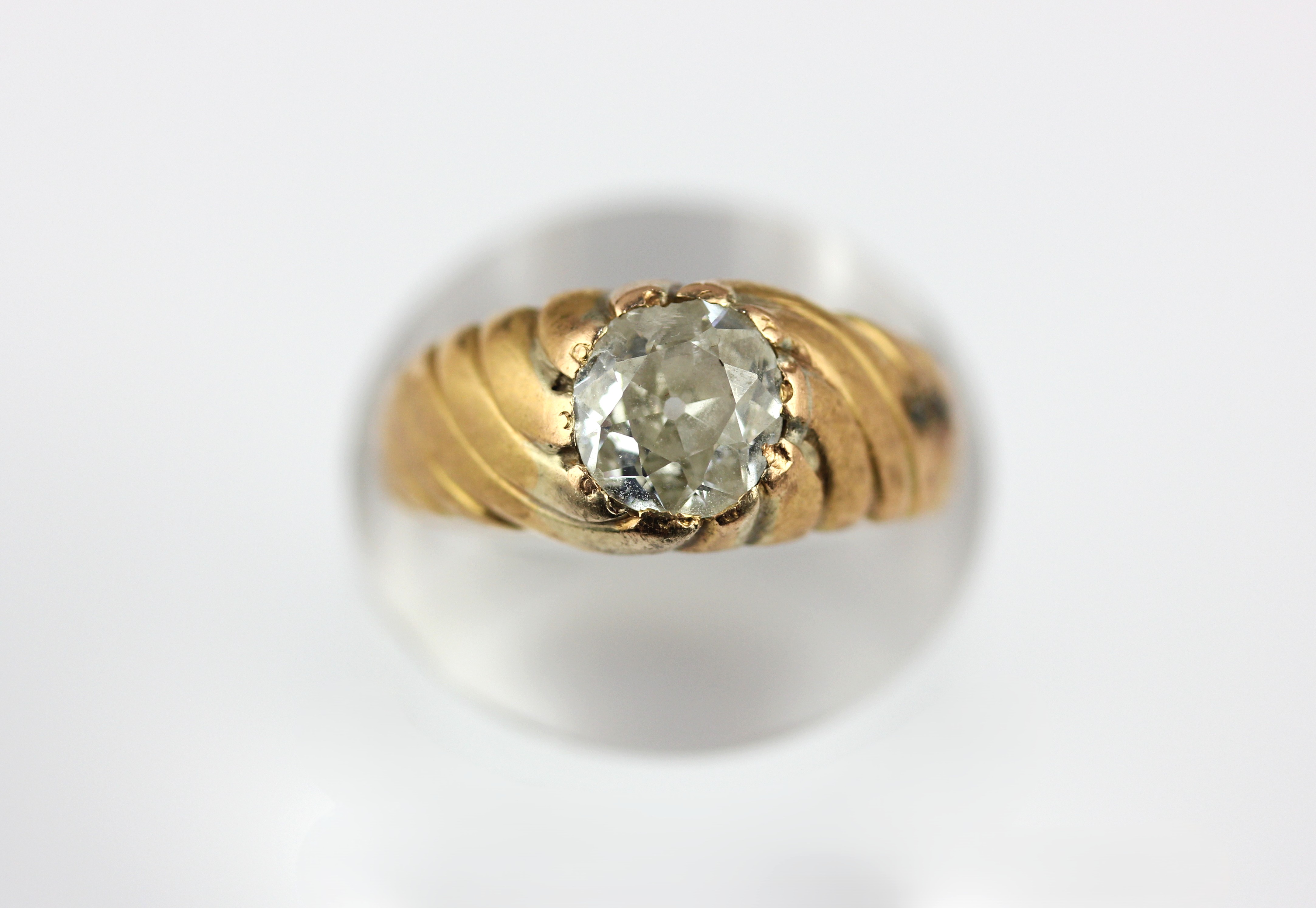 A gentlemans gold and diamond single stone ring mounted with an old cut cushion shaped diamond, the mount with slanting decoration, unmarked, ring size Q, gross weight 8.8 gms