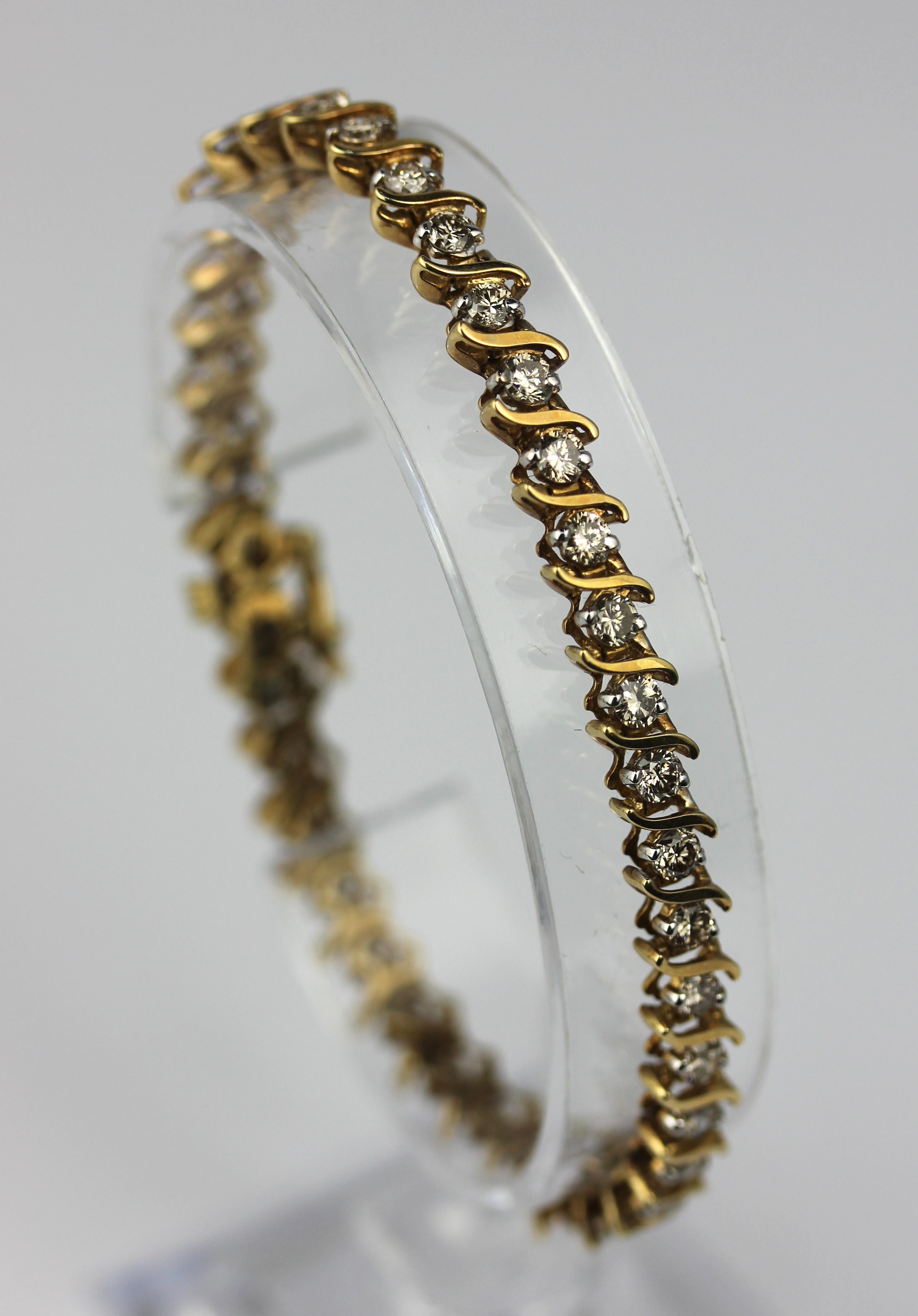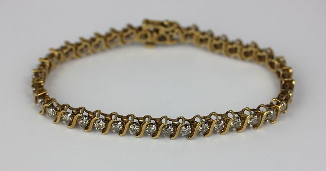 A gold and diamond set line bracelet, claw set with circular cut diamonds alternating with separating links, detailed '14k', on a snap clasp, gross weight 14g, length 17.7cm