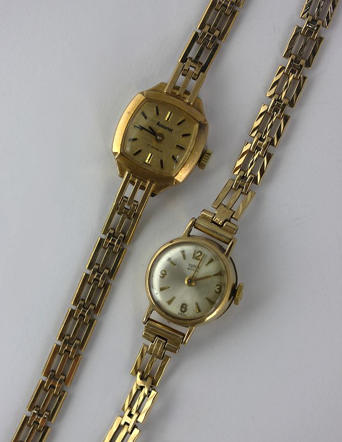A Tudor 9 carat gold cased ladies wristwatch the jewelled movement signed Tudor the inner case back detailed Rolex Edinburgh 1965 with an associated 9ct gold bracelet and Rolex guarantee booklet gross weight excluding the movement 7.9g also an accurist 9 carat gold ladies bracelet wristwatch gross weight 13.4g including the movement with an accurist box