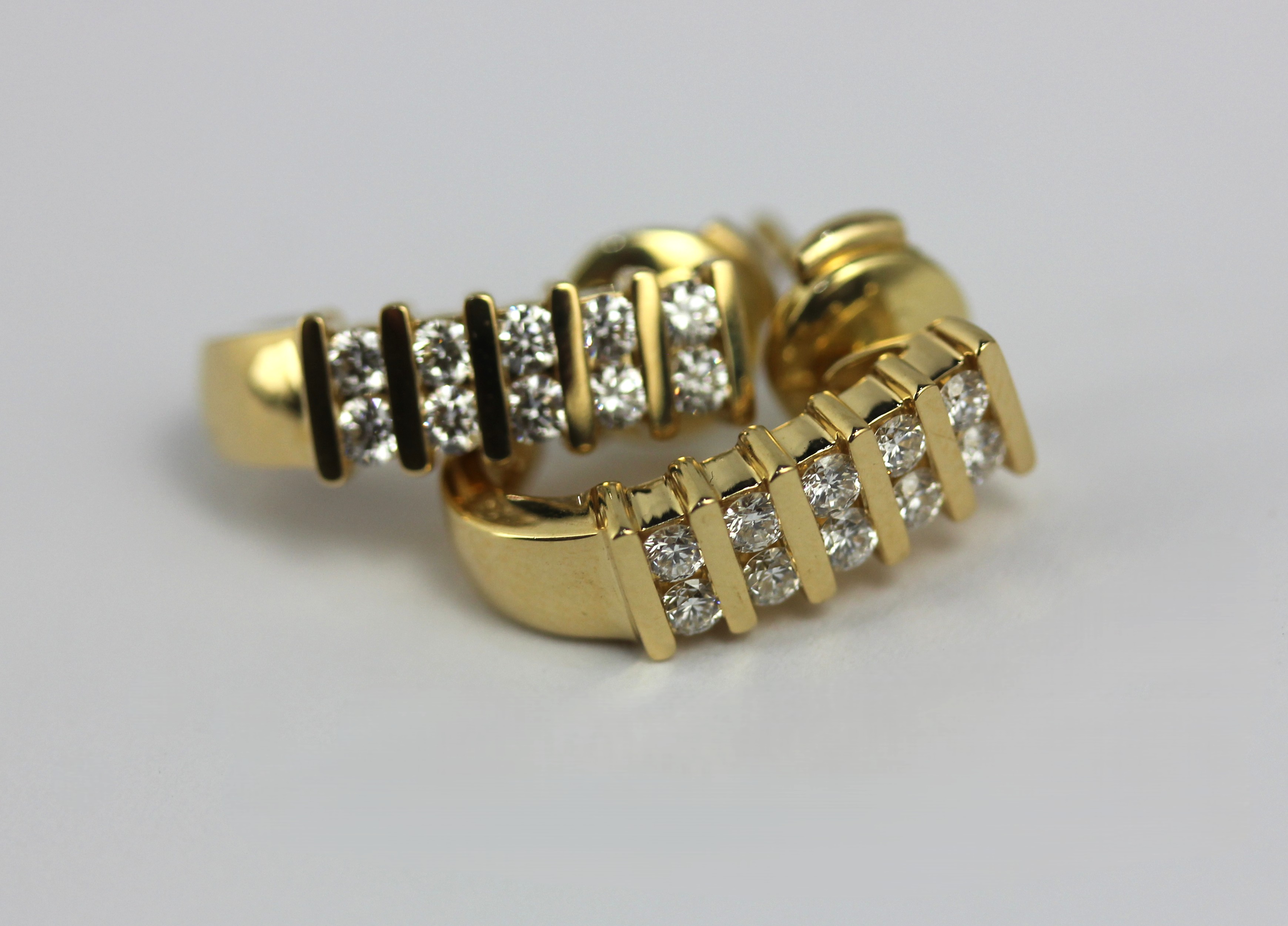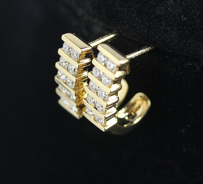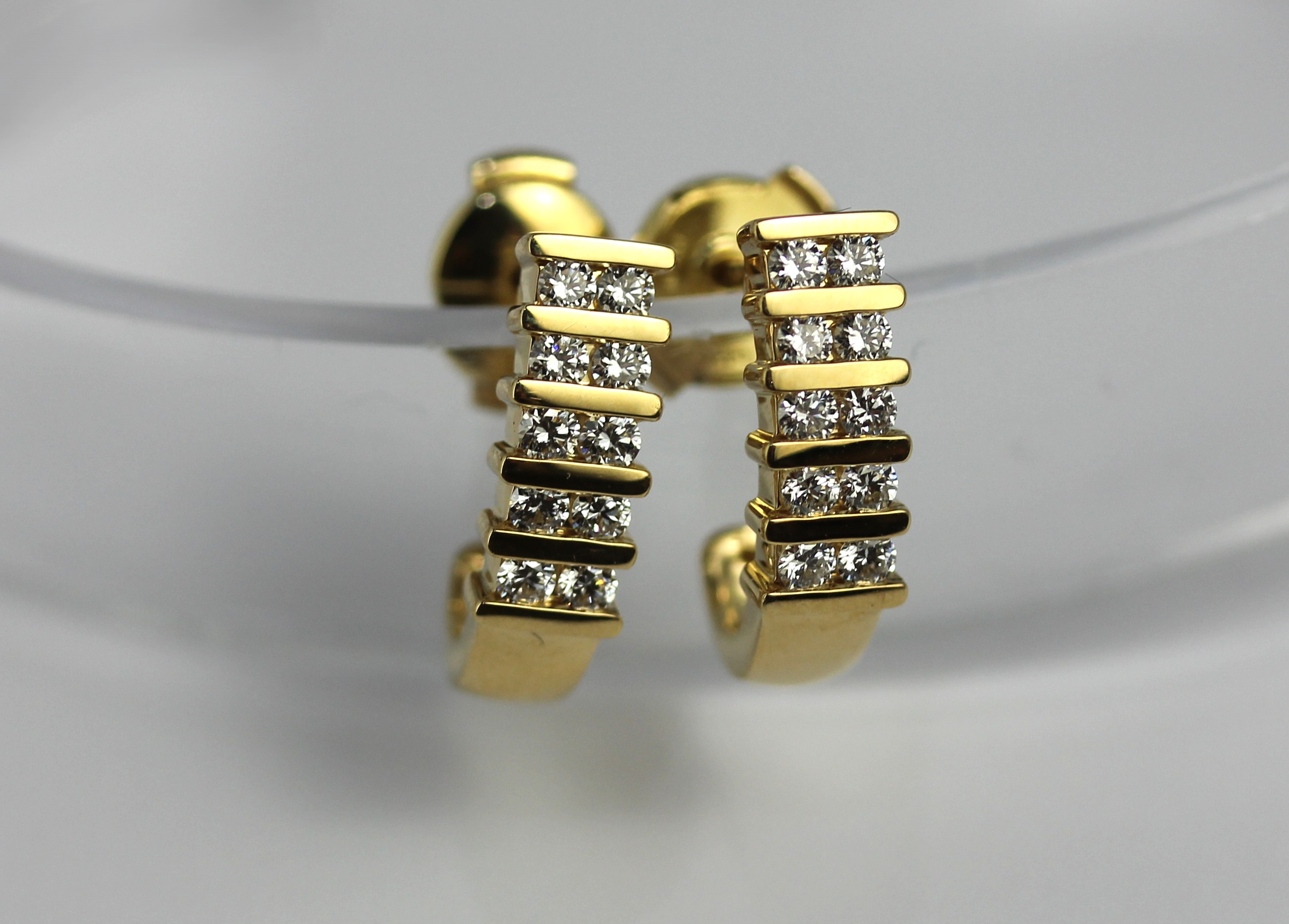 A pair of 18ct gold and diamond earrings each in a curved design mounted with five pairs of circular cut diamonds with post and clip fittings gross weight 4.4g