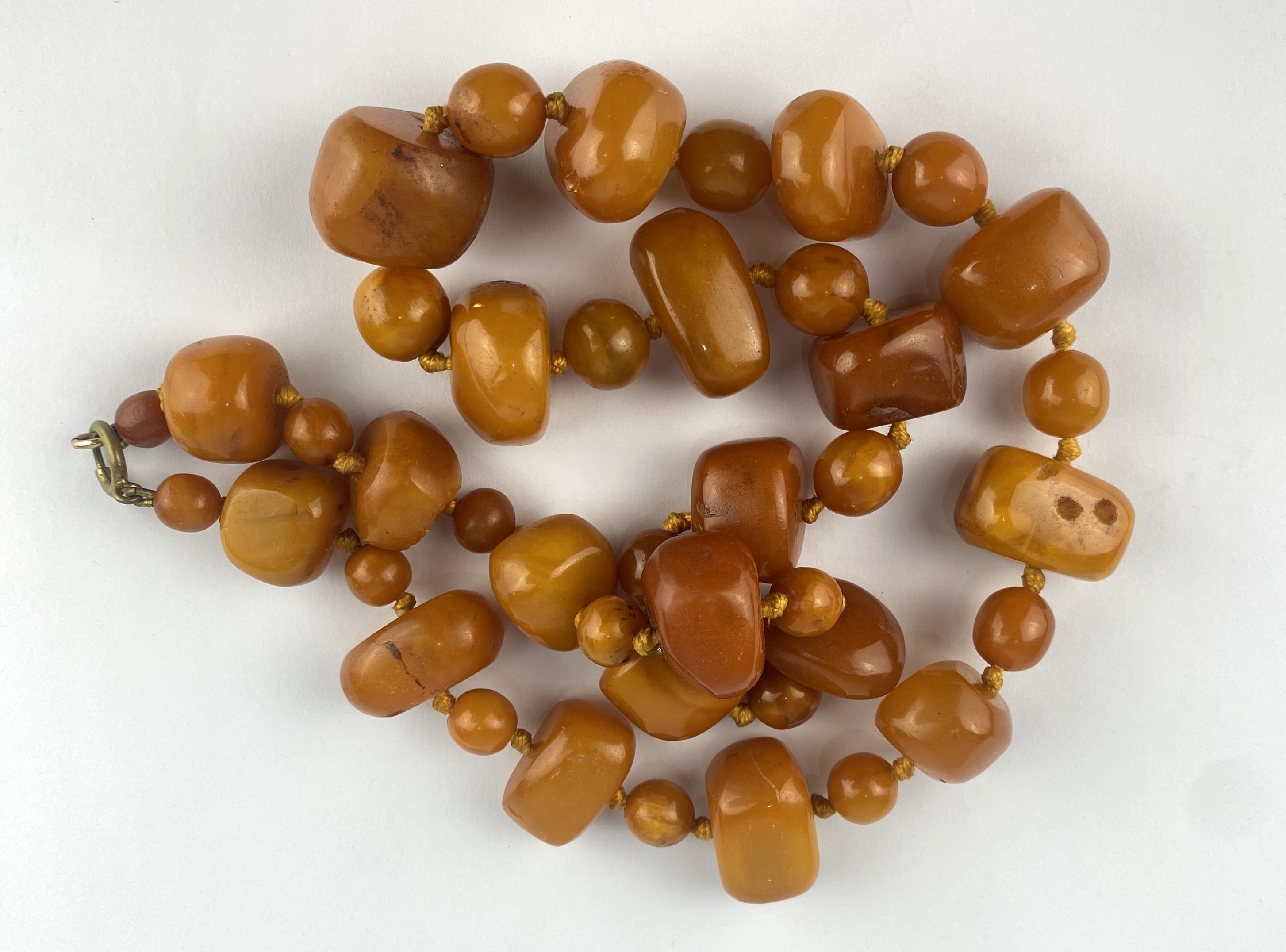 A single row necklace of vari-coloured butterscotch opaque amber beads gross weight 124g