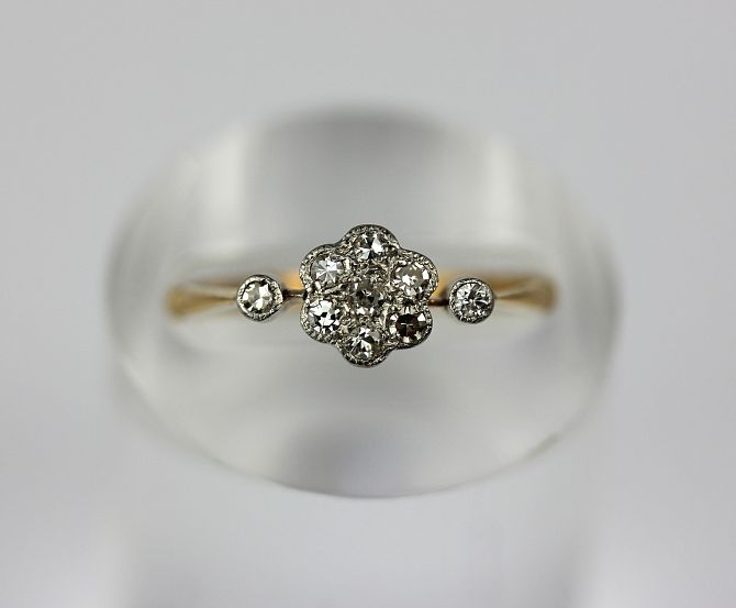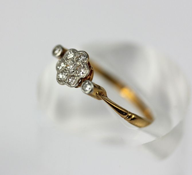 A gold and diamond seven stone cluster ring with diamond set sides mounted with circular cut diamonds detailed 18ct ring size L and a half gross weight 1.5g