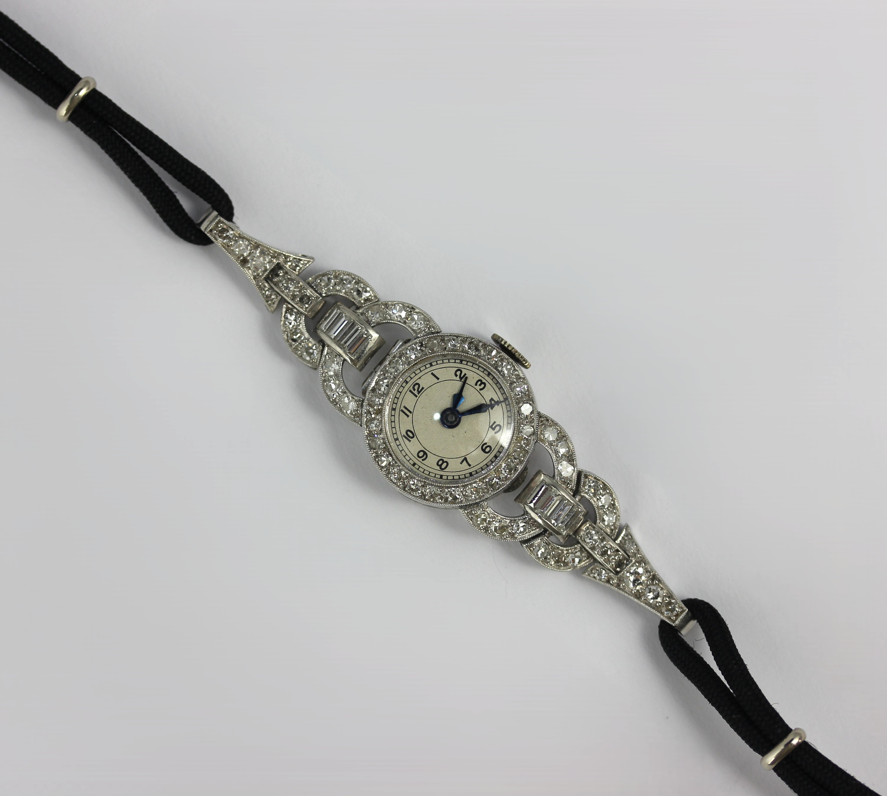 A lady’s platinum cased and diamond set dress wristwatch with a jewelled lever movement detailed Swiss made, the unsigned silver dial with Arabic numeral,s the case bezel and strap mountings set with circular and baguette diamonds detailed within the case back all plat with a black textile cord strap