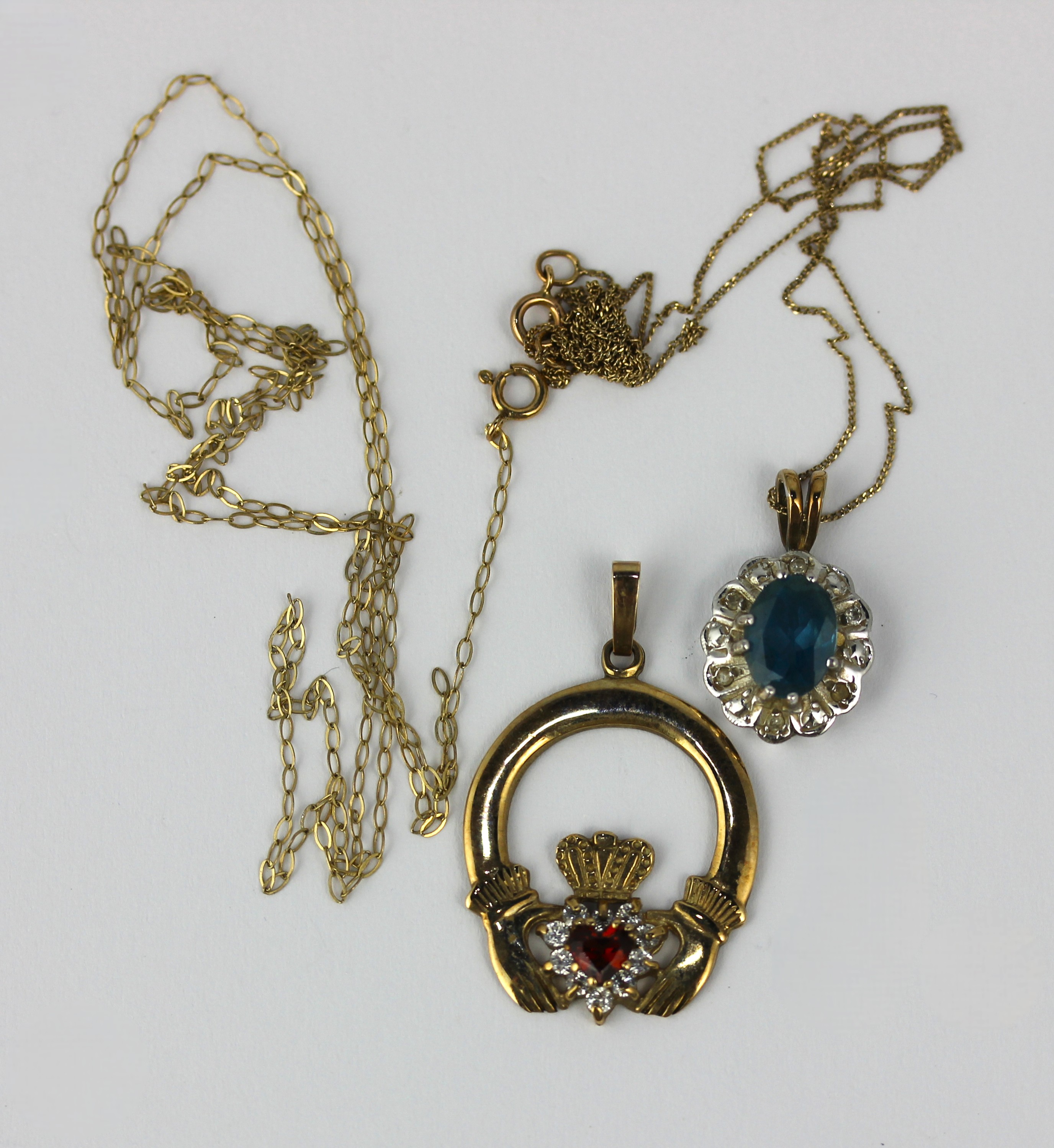 A 9ct gold, garnet and colourless gem set claddagh pendant with a gold neck chain [broken] and a 9ct gold, blue topaz and diamond oval cluster pendant, with a gold neck chain combined gross weight 4.1g