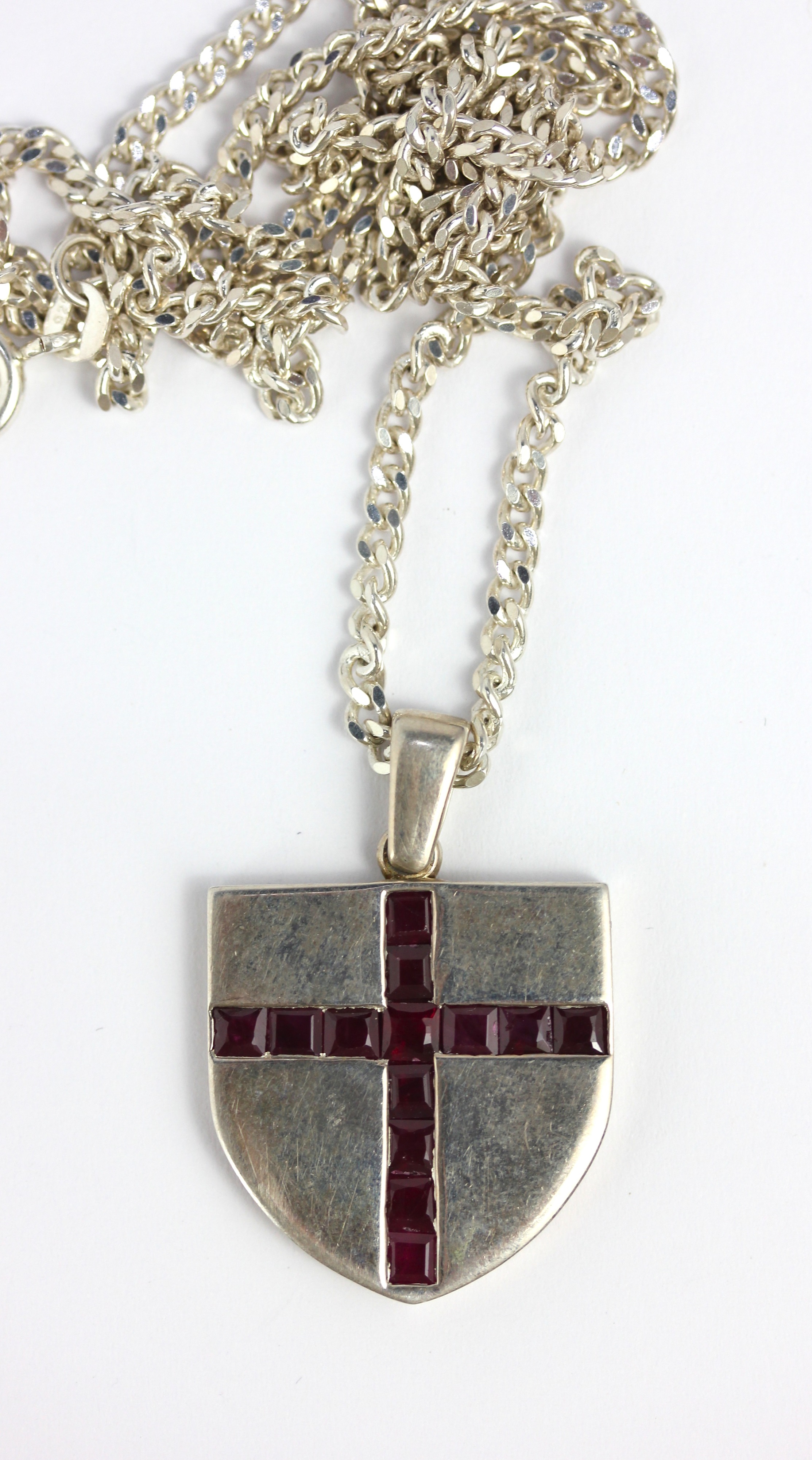 A silver and ruby pendant designed as a shield of St George with a silver faceted curb link neck chain on a bold ring clasp detailed 925 length of chain 56cm, weight 22g with a case and a box