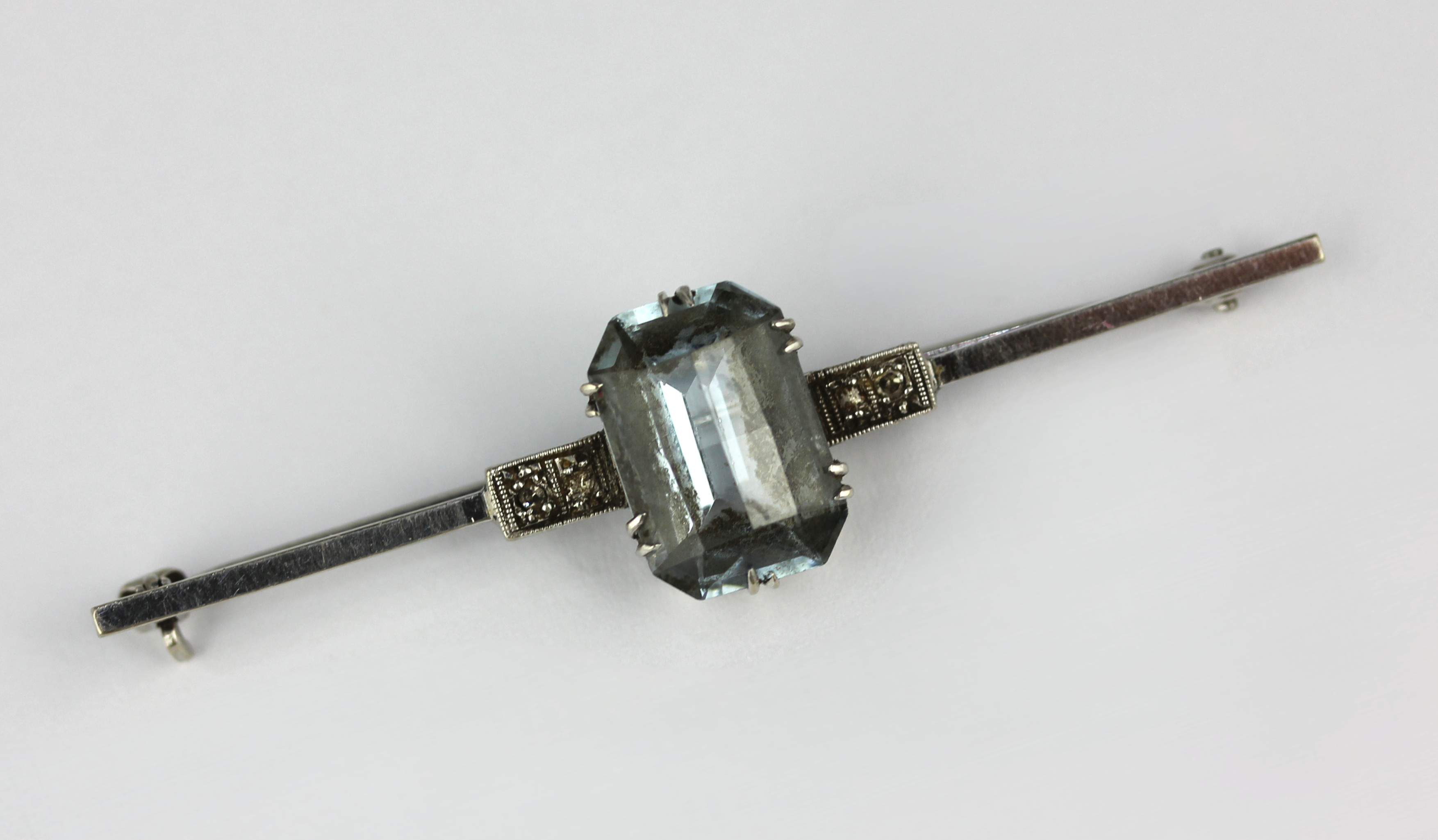 A white gold, aquamarine and diamond bar brooch detailed '9ct', gross weight 3.7g