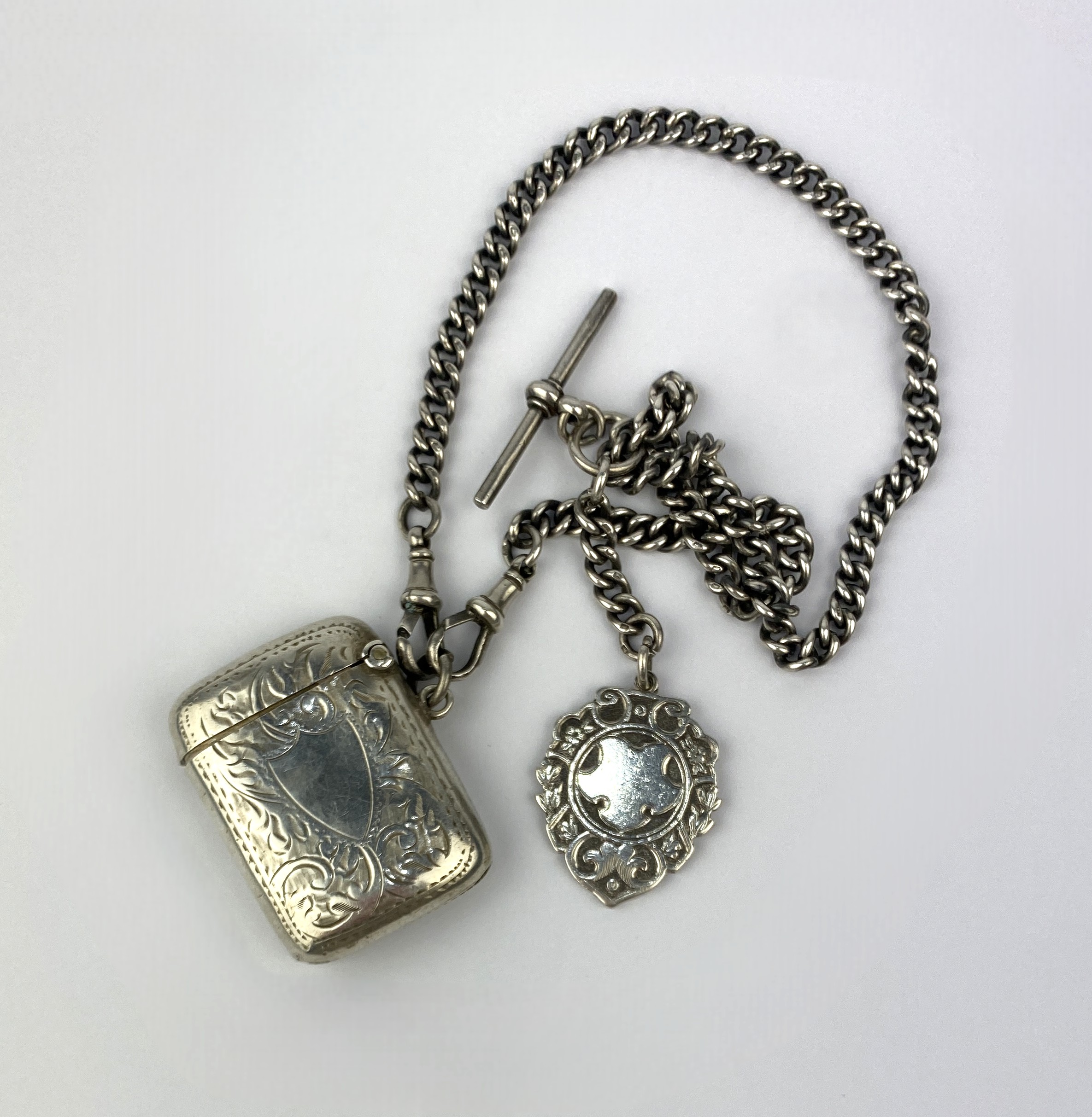 A silver curb link watch Albert chain with a silver fob medal Birmingham 1904 and a silver vesta case Birmingham 1915 gross weight 79g