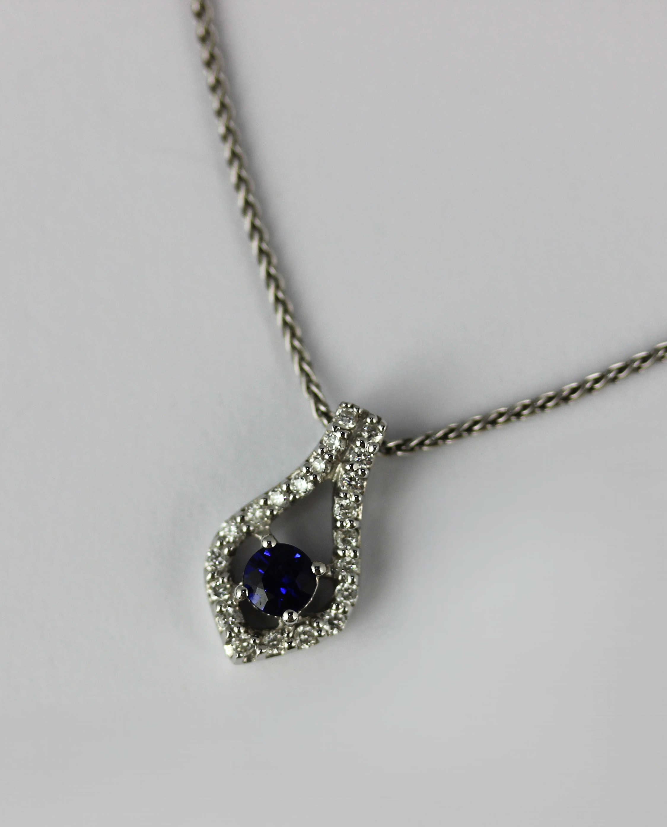 An 18ct white gold sapphire and diamond drop shaped pendant with an 18ct white gold neck chain gross weight 3.2g