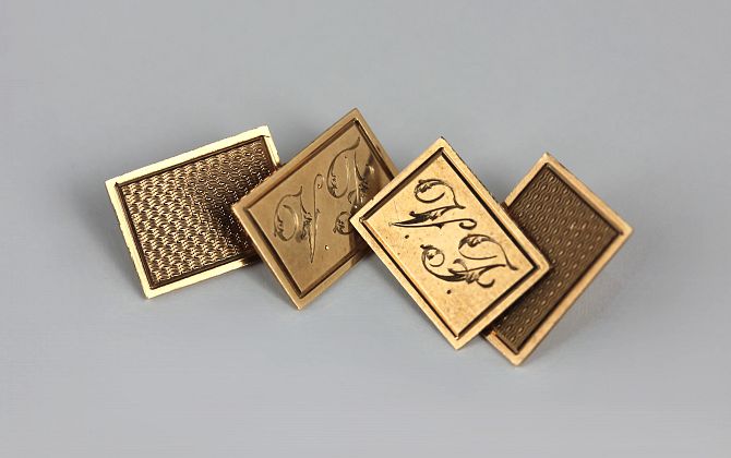 A pair of 9ct gold rectangular cufflinks, each initial-engraved to one side and engine-turned to the other side, detailed to the backs 15.6.57, combined weight 6 gms, with a case