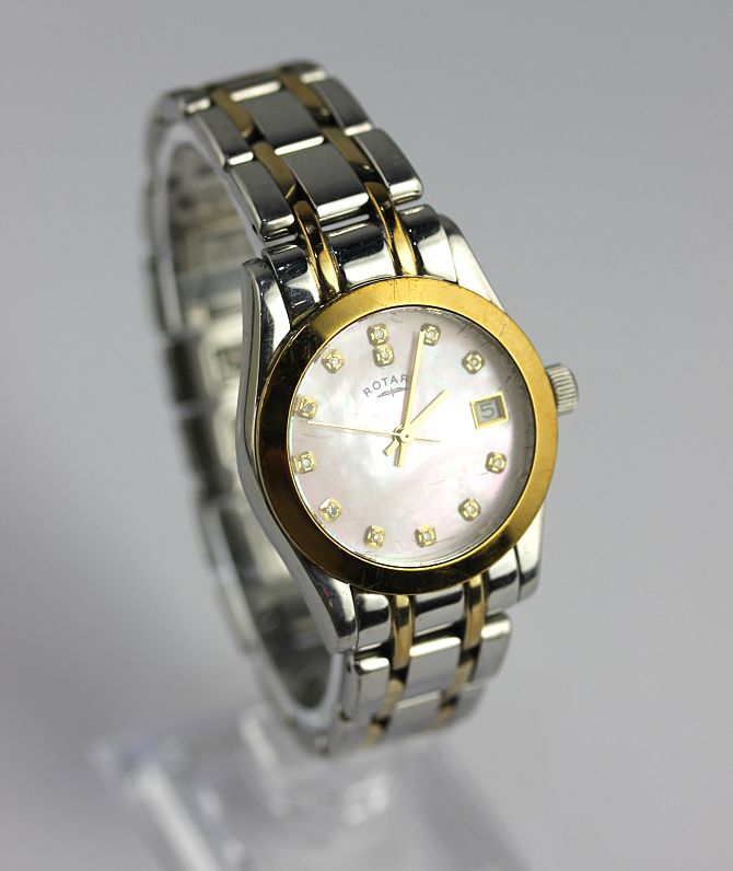 A Rotary Rocks steel and gilt metal gentlemans bracelet wristwatch, the pink mother of pearl effect dial having diamond set numerals, and date of the month aperture, with a Rotary book and box