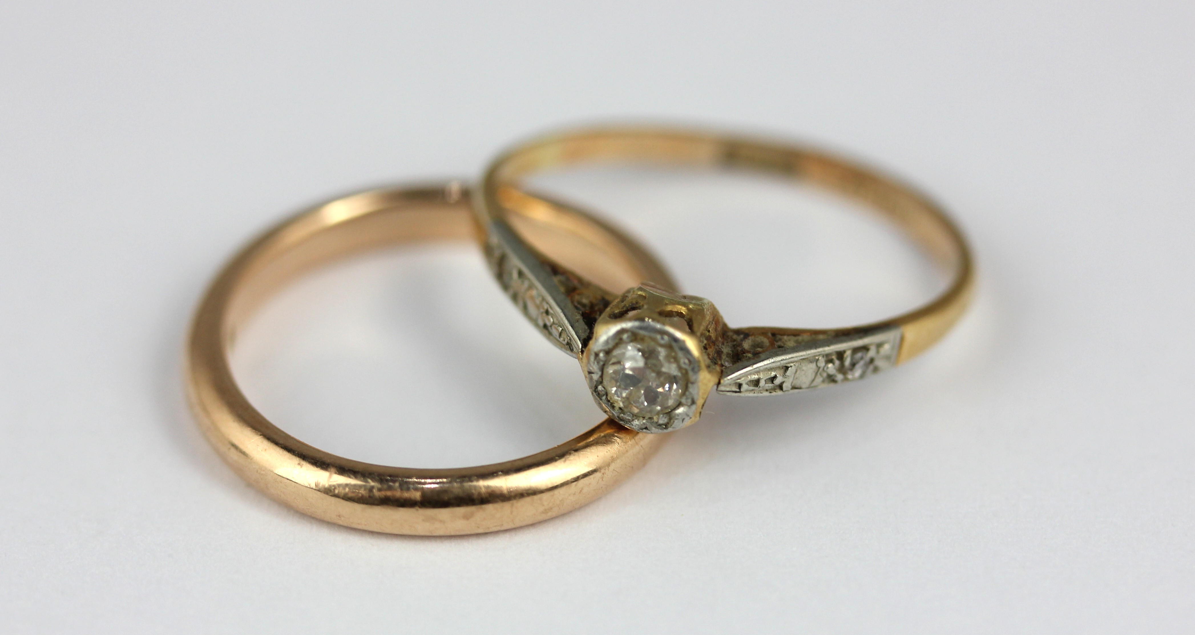 A gold and platinum ring set with a cushion shaped diamond detailed 18ct platinum sze K, gross weight 1.5 gms, and a gold wedding ring detailed 15 size K weight 3.2 gms
