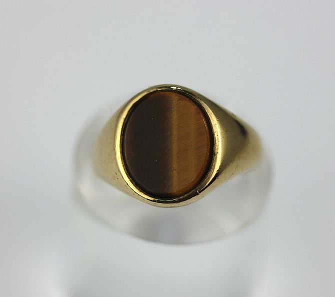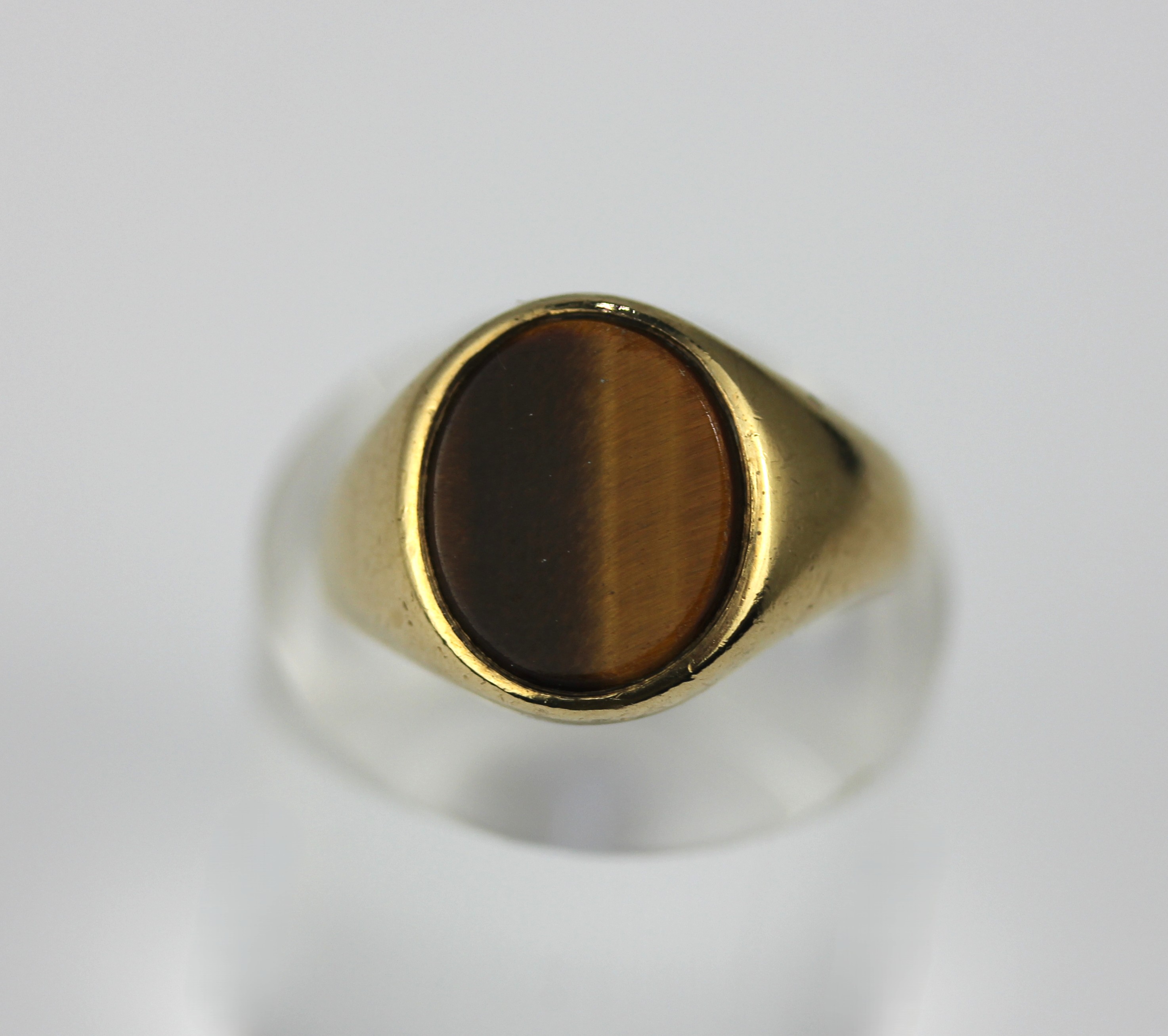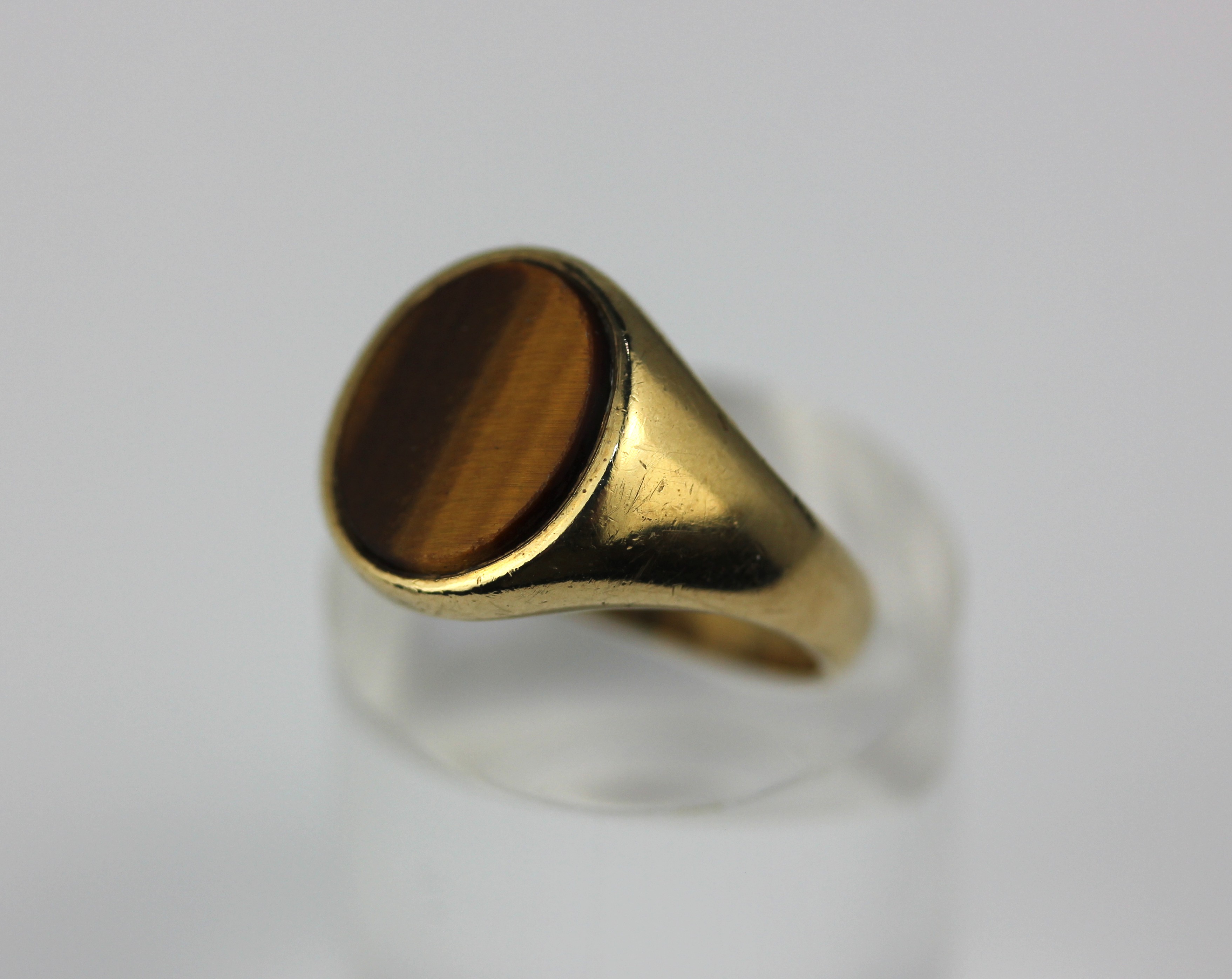 A 9ct gold and oval tigers eye signet ring ring size P gross weight 6.7g
