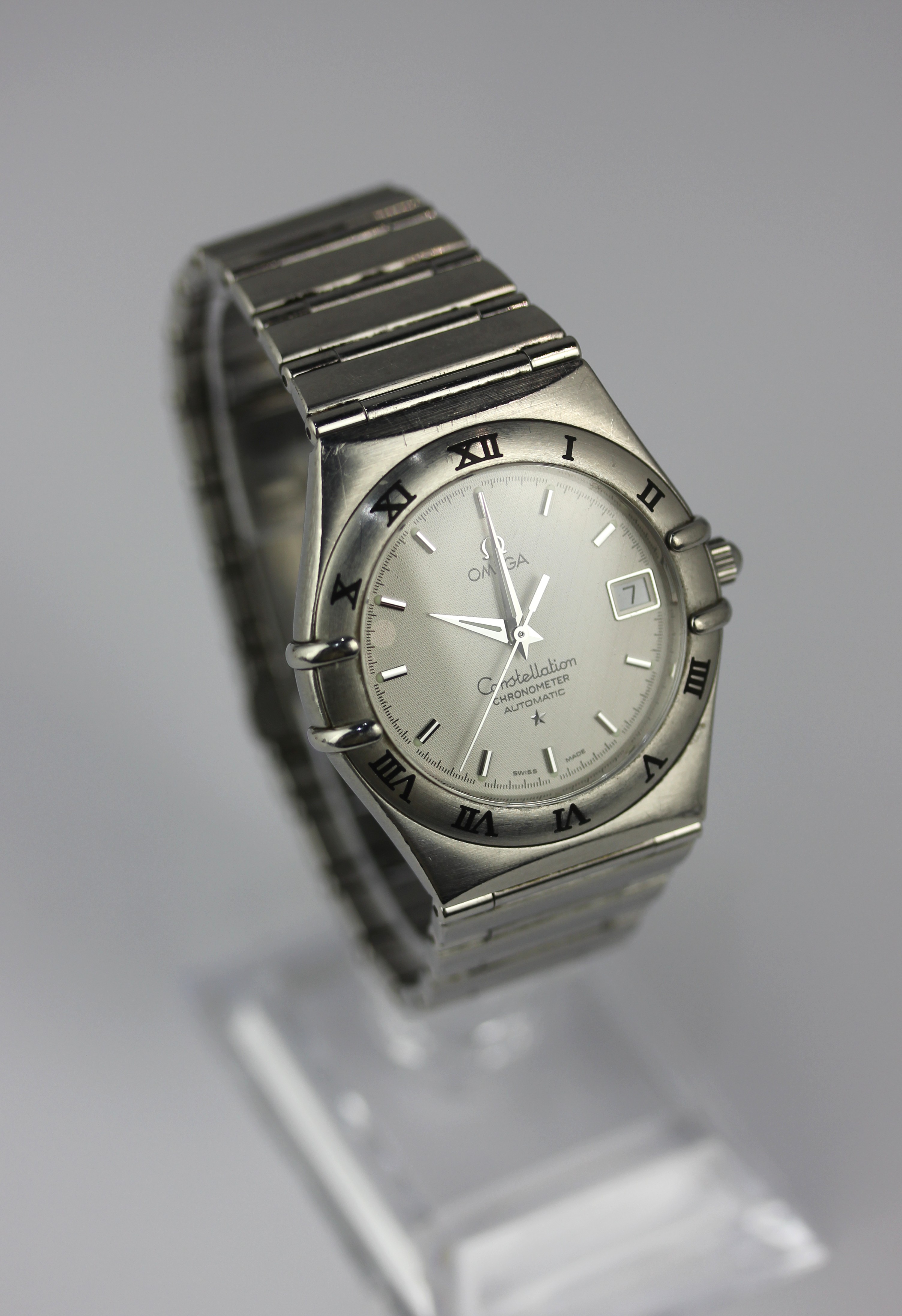 An Omega Constellation Automatic steel gentlemans bracelet wristwatch the signed silver dial with baton hour markers centre seconds and with date aperture, the case back numbered 81343099