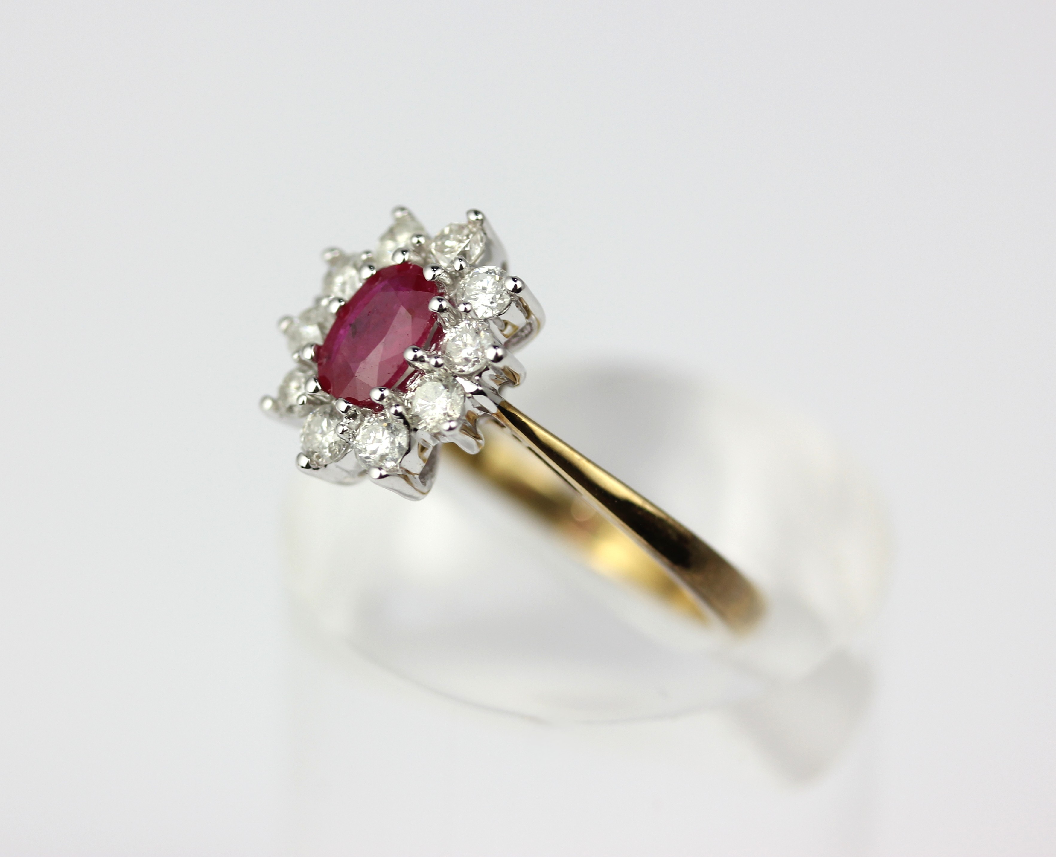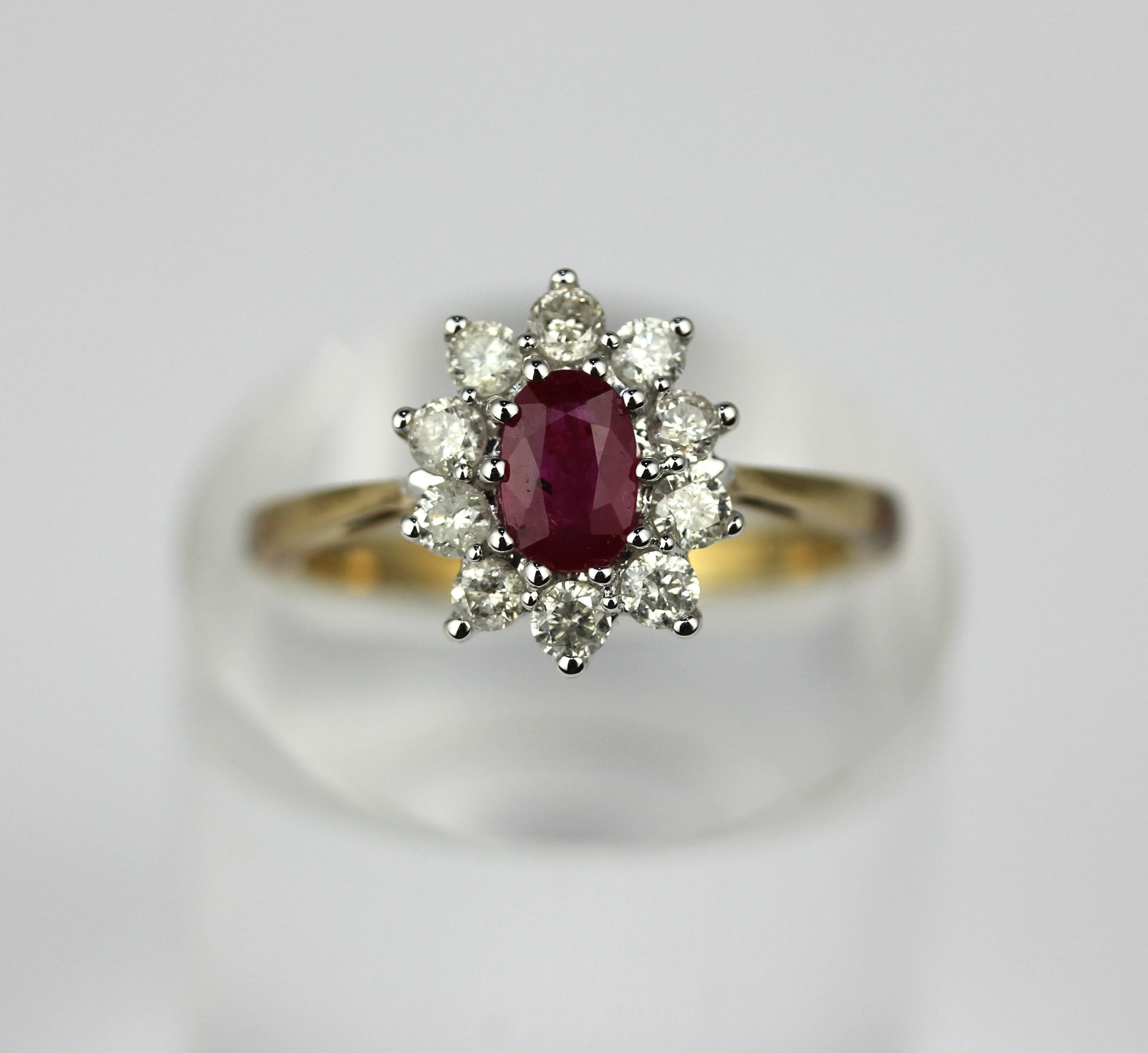 A 9ct gold ruby and diamond oval cluster ring claw set with the oval cut ruby at the centre within a surround of ten circular cut diamonds, ring size M and a half gross weight 3.2g