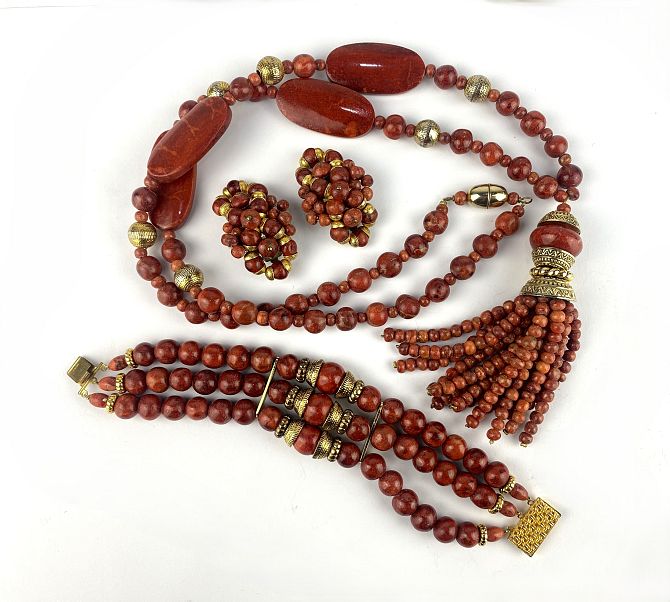 A group of treated coral jewellery comprising a necklace with a tassle drop, a three row bracelet and a pair of earrings