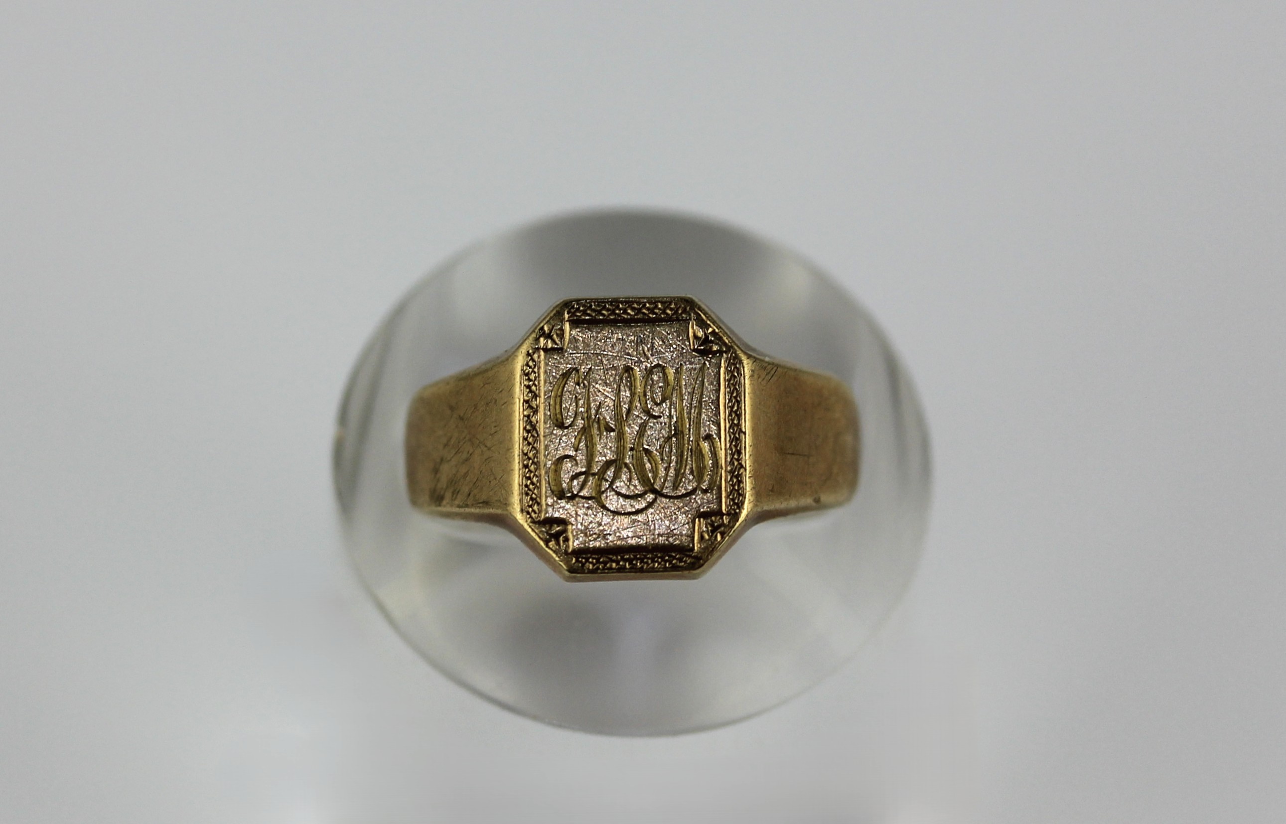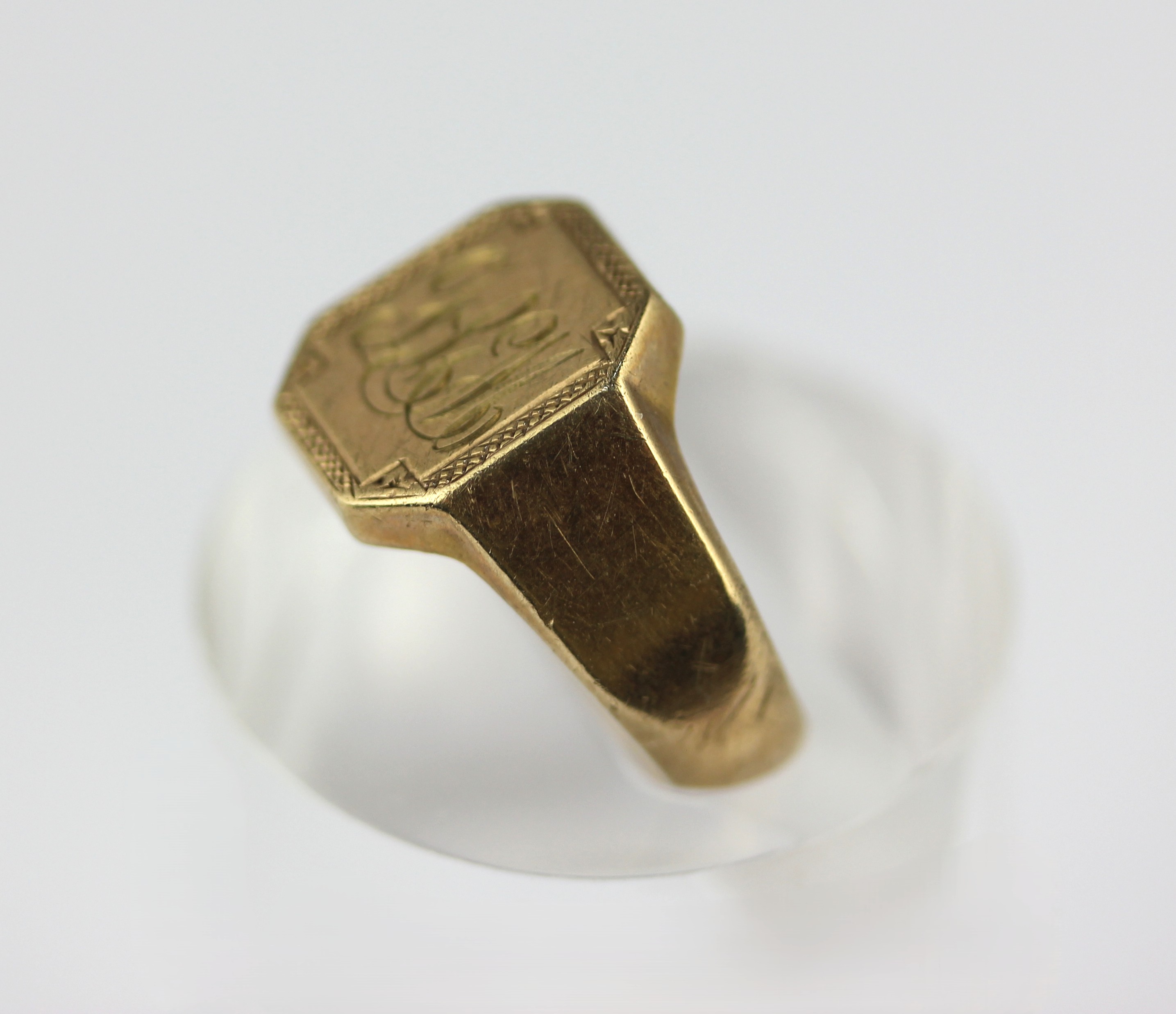 A 9ct gold cut cornered rectangular signet ring, monogram engraved, size K 1/2, weight 3.3g