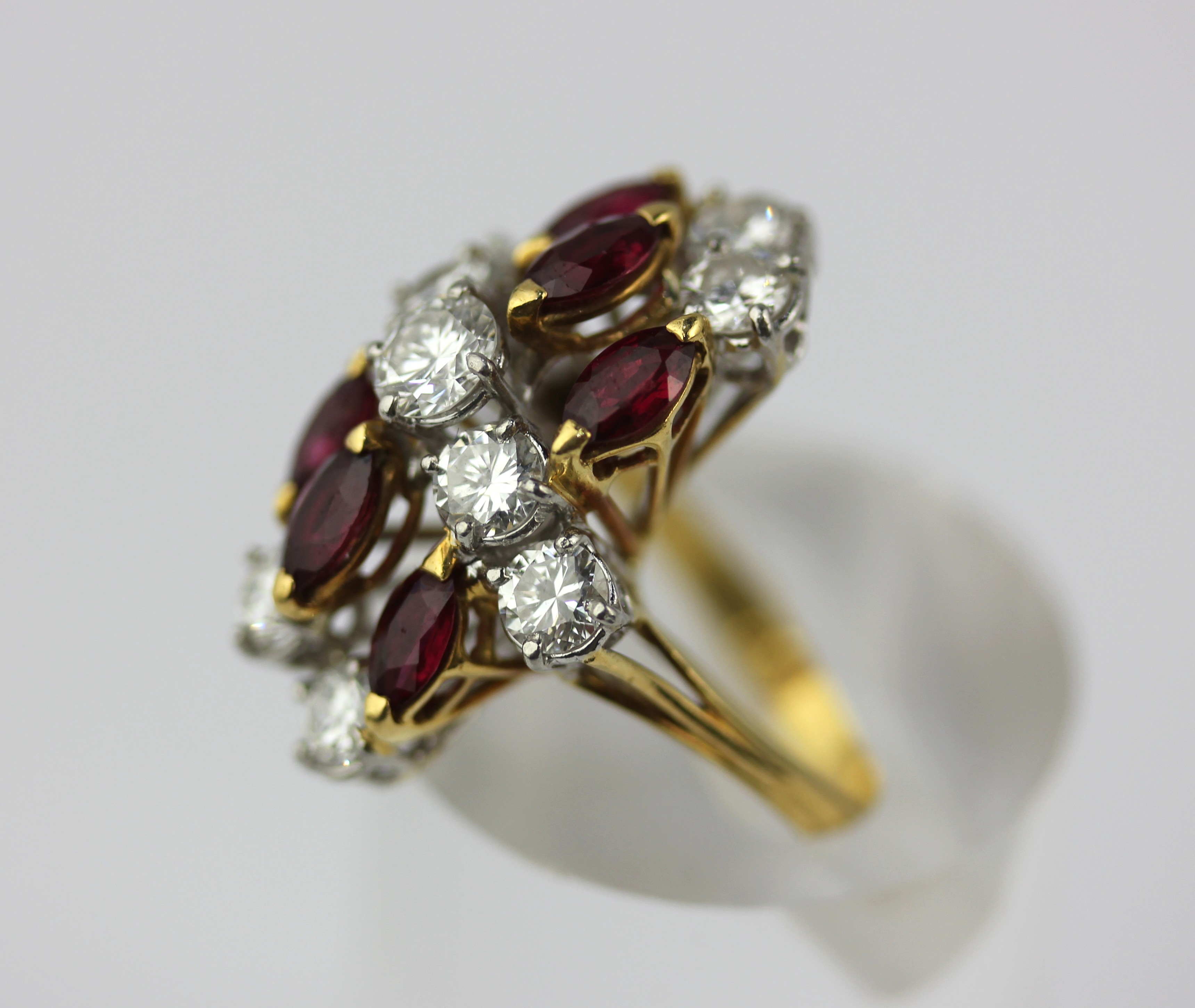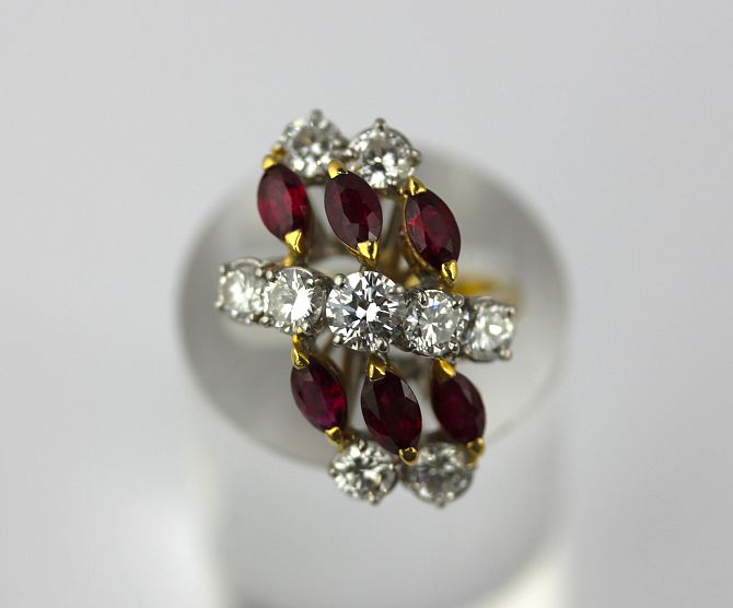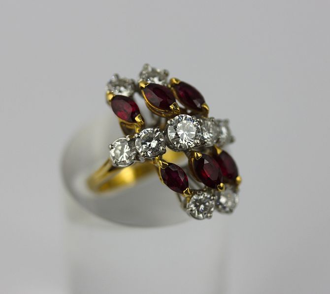 An 18 ct gold and platinum, ruby and diamond ring claw set ring with a row of five graduated circular cut diamonds at the centre between two rows of three marquise shaped rubies and with two pairs of circular cut diamonds mounted at each side, import mark London 1975 ring size K gross weight 7.5g with a case