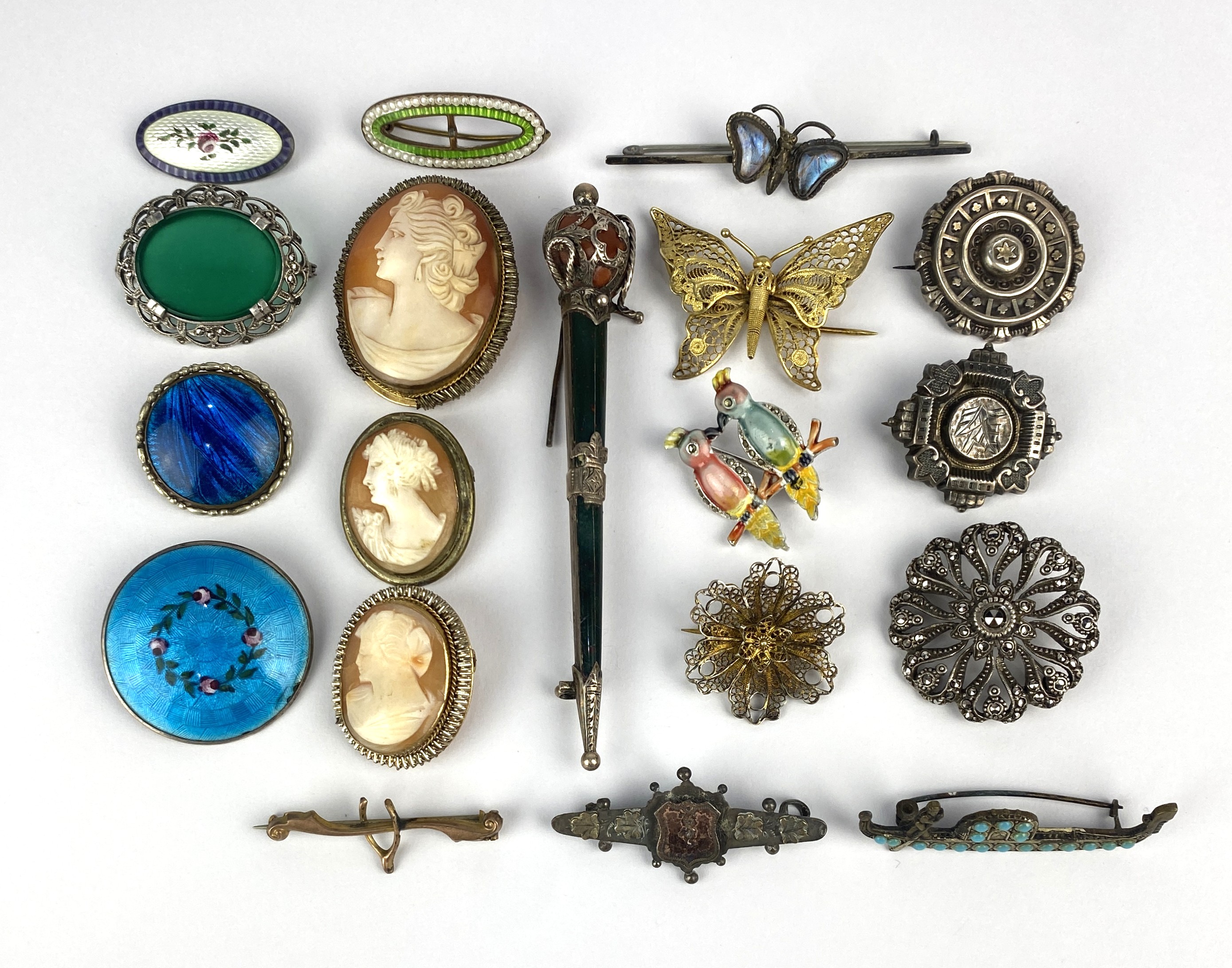 A group of nineteen brooches including three cameo brooches and two gilt filigree brooches