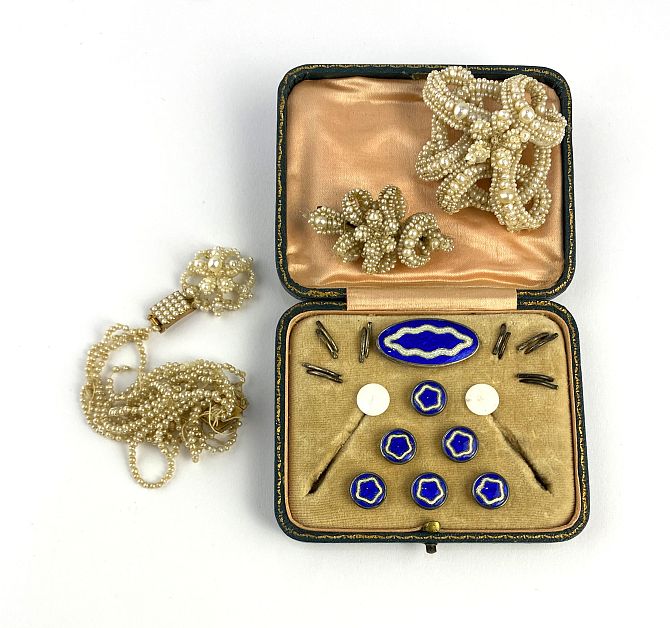 Two mother of pearl and seed pearl brooches, an imitation seed pearl bracelet with a mother of pearl and seed pearl cluster on a gold and seed pearl rectangular clasp, also a blue enamelled and silver mounted oval brooch and six buttton set with a case