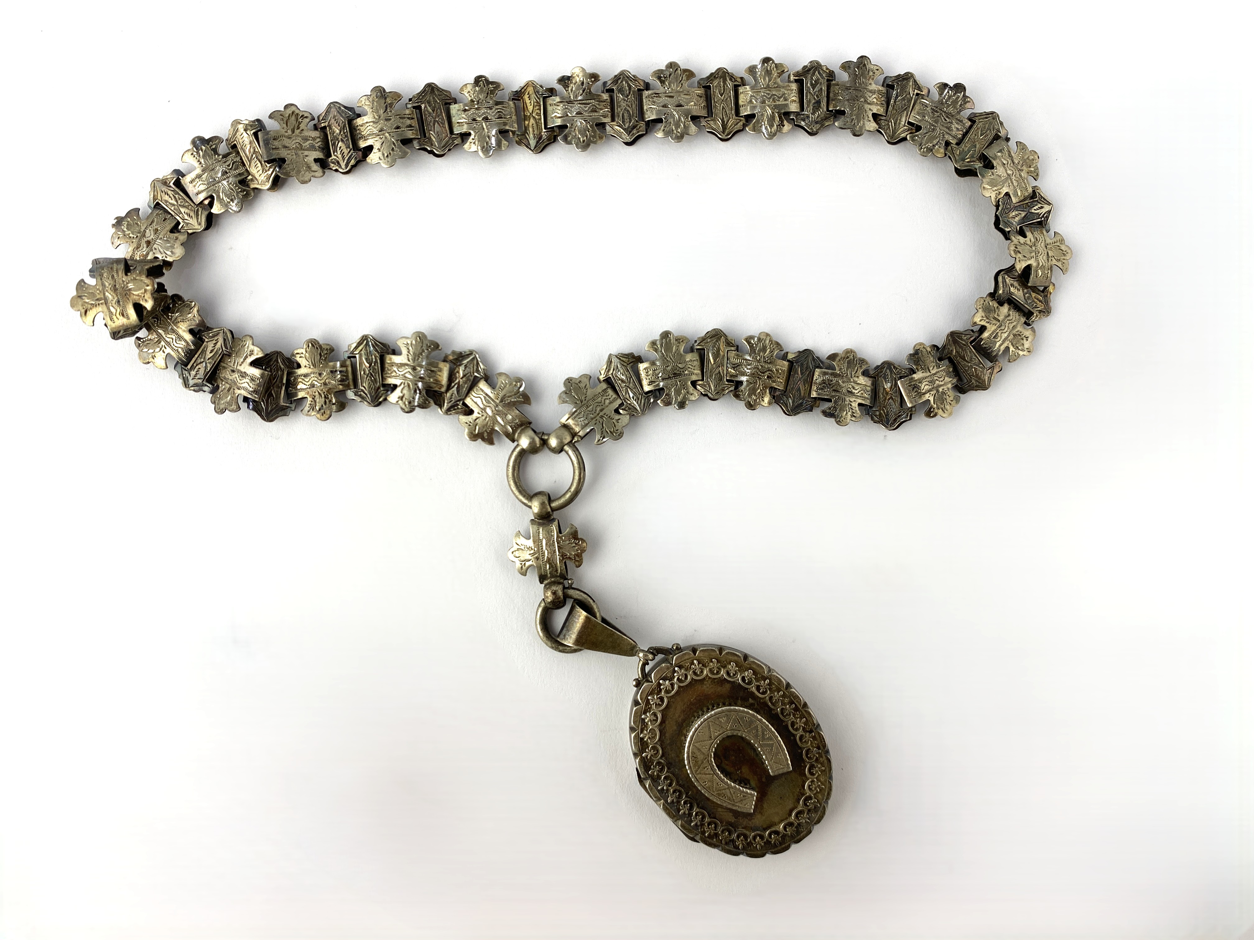 A Victorian silver shaped oval pendant locket the front with a horseshoe motif Birmingham 1886 with a collar necklace having engraved decoration gross weigh 46g