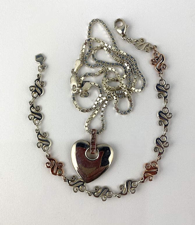 Two items of Clogau jewellery comprising a silver and gilt chain link bracelet, the three gilt links diamond set, length 19 cm, and a heart shaped pendant detailed cariad with a silver square link neck chain, length 45 cm, both having sprung hook shaped clasps, combined gross weight 22.1 gms