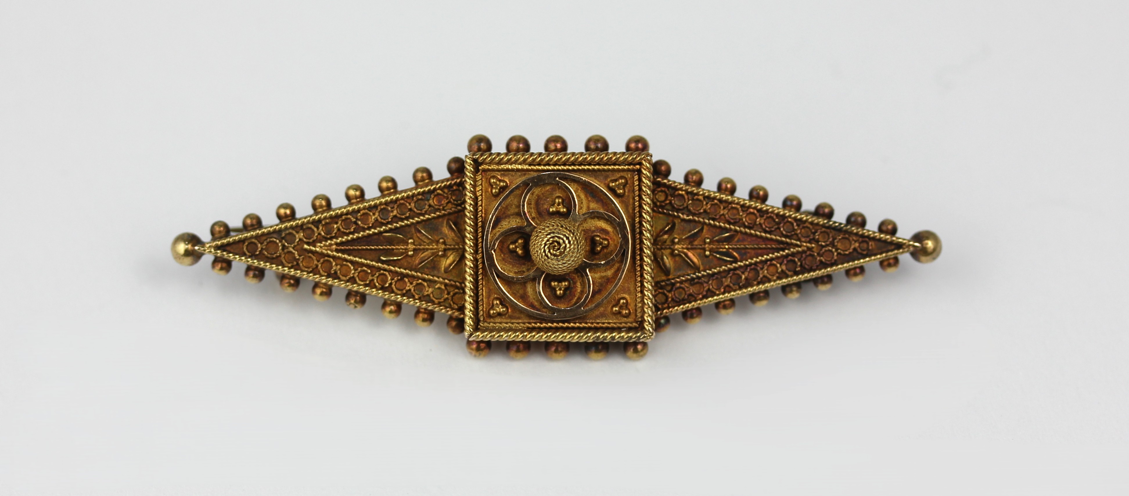 A late Victorian gold brooch with applied bead and wirework decoration the back glazed with a locket compartment, indistinct mark to the back of hinge, length 5.6cm gross weight 7g with an associated case