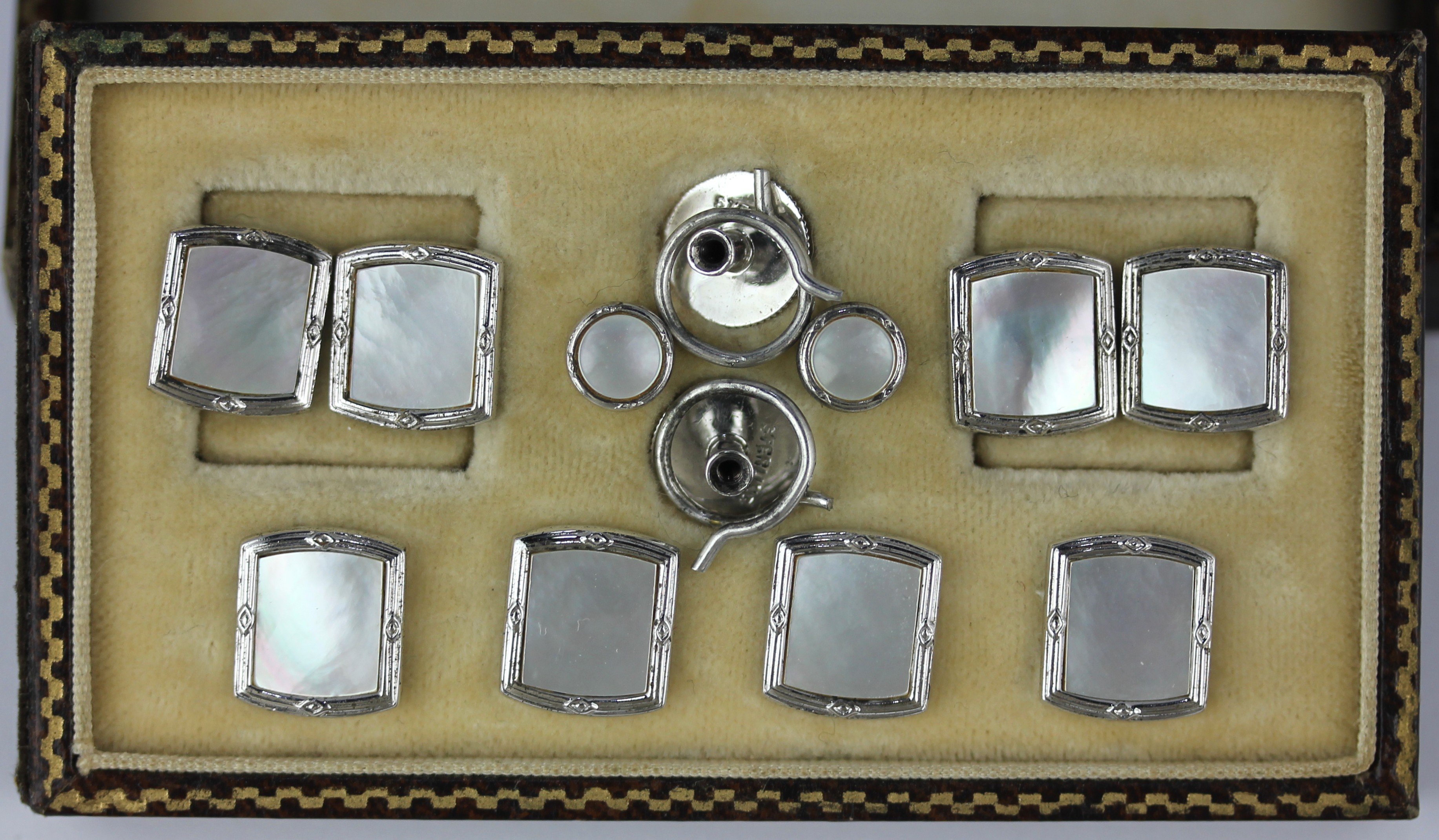 A sterling silver and mother of Pearl evening wear dress set comprising four buttons, a pair of cufflinks and a pair of studs detailed sterling with a case