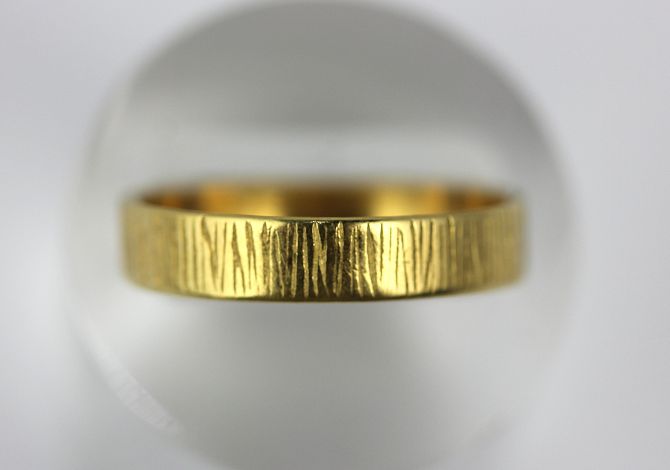 An 18ct gold wedding band having bark textured decoration, Birmingham 1972, ring size N, weight 2.7 gms