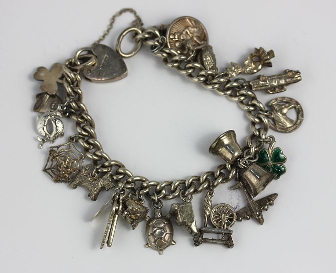 A silver curb linked charm bracelet fitted with a variety of silver charms including a Toby jug, a motor car,a swan and a spinning wheel gross weight 60.5g