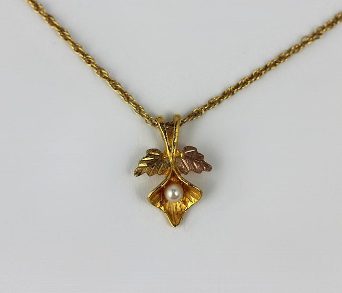 A 9ct two colour gold and cultured pearl orchid pendant with a 9ct gold neck chain gross weight 2.3g