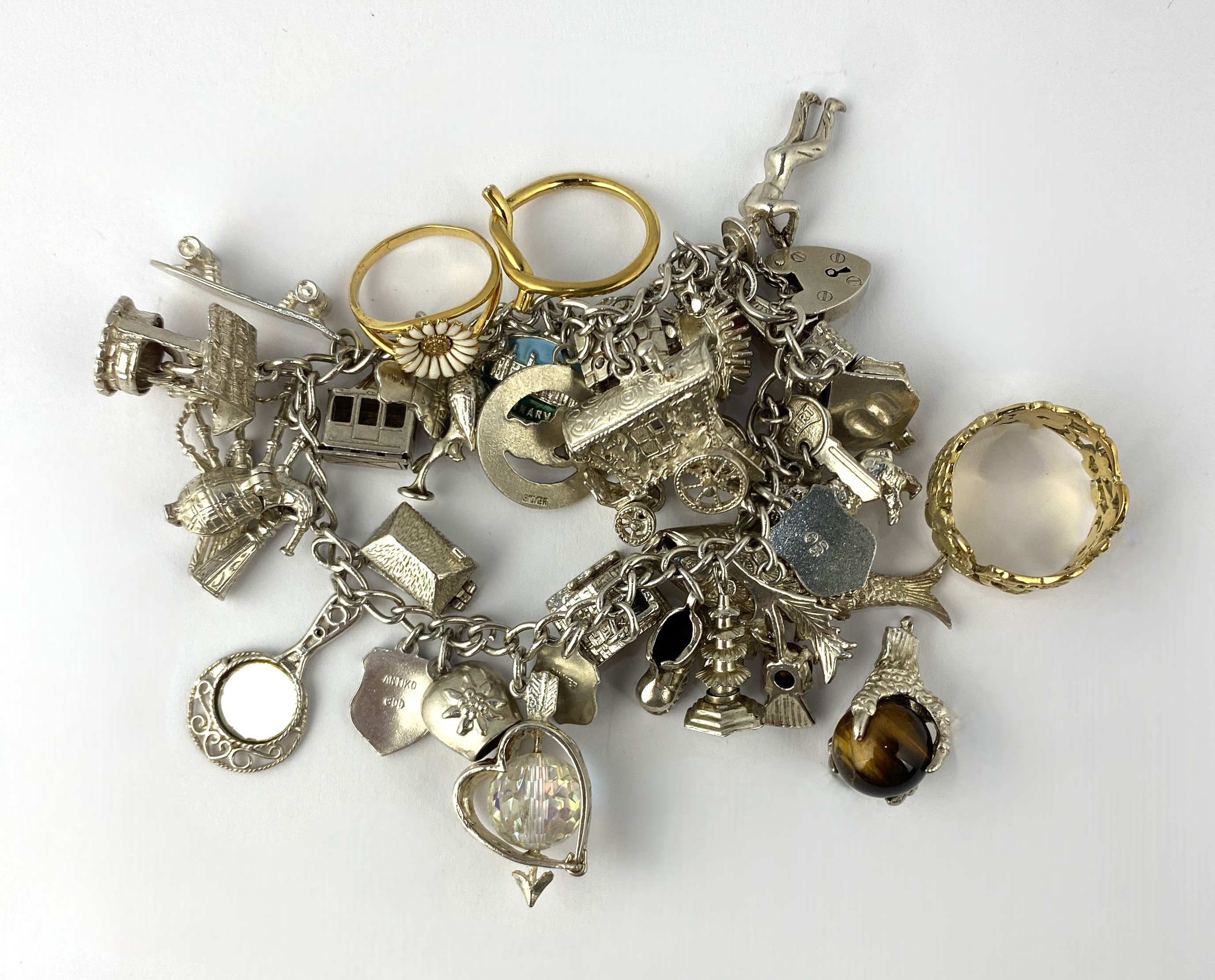 A group of silver and silver gilt jewellery comprising a charm bracelet having a heart-shaped padlock clasp, a tiger's eye claw and ball charm, and three silver gilt rings comprising a white enamelled flower, wideband ring, pierced with floral decoration, and a colourless gem twist ring, combined gross weight 100.3 gms