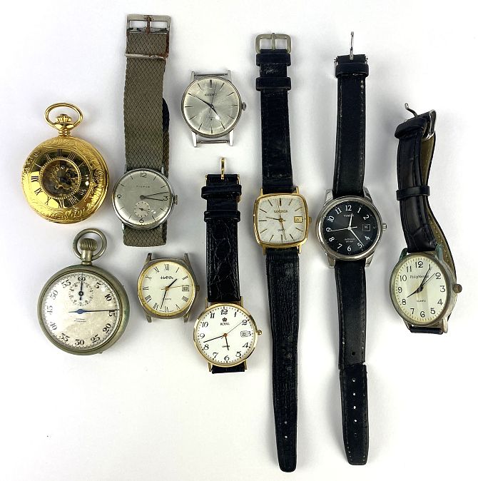 A collection of watches: comprising a Swiss made Bavaroy stop watch, an Everite half hunter pocket watch, and seven wristwatches by Sekonda, Seiko, Philip Mercier, Pierce, Royal, Hana, and Timex, (9).