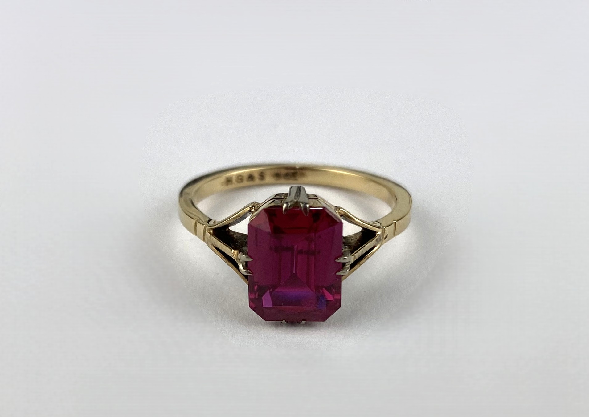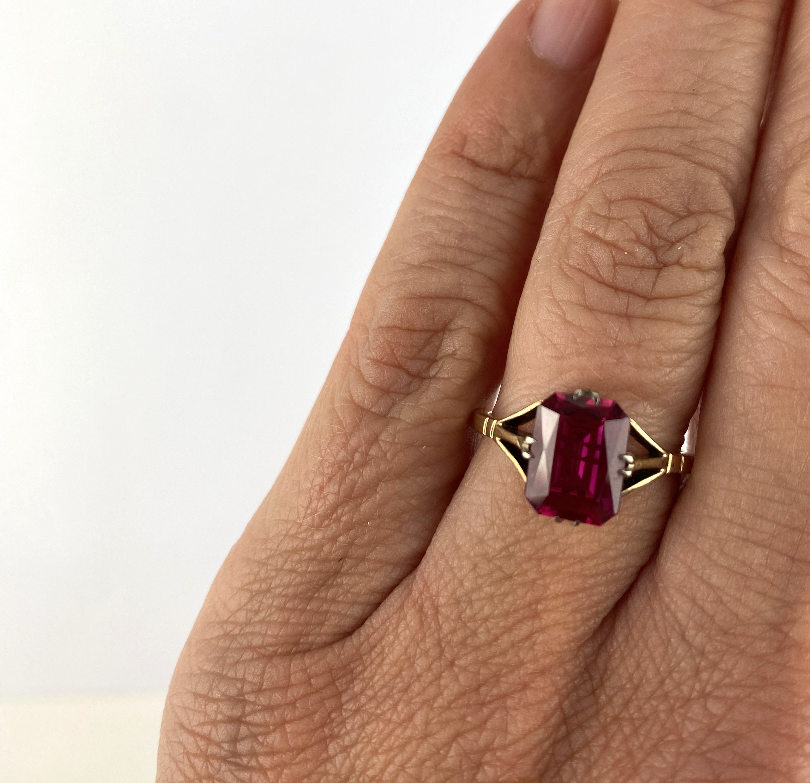A gold and synthetic red gem set solitaire ring detailed 9ct, ring size M 1/2, gross weight 2.6g, with a case