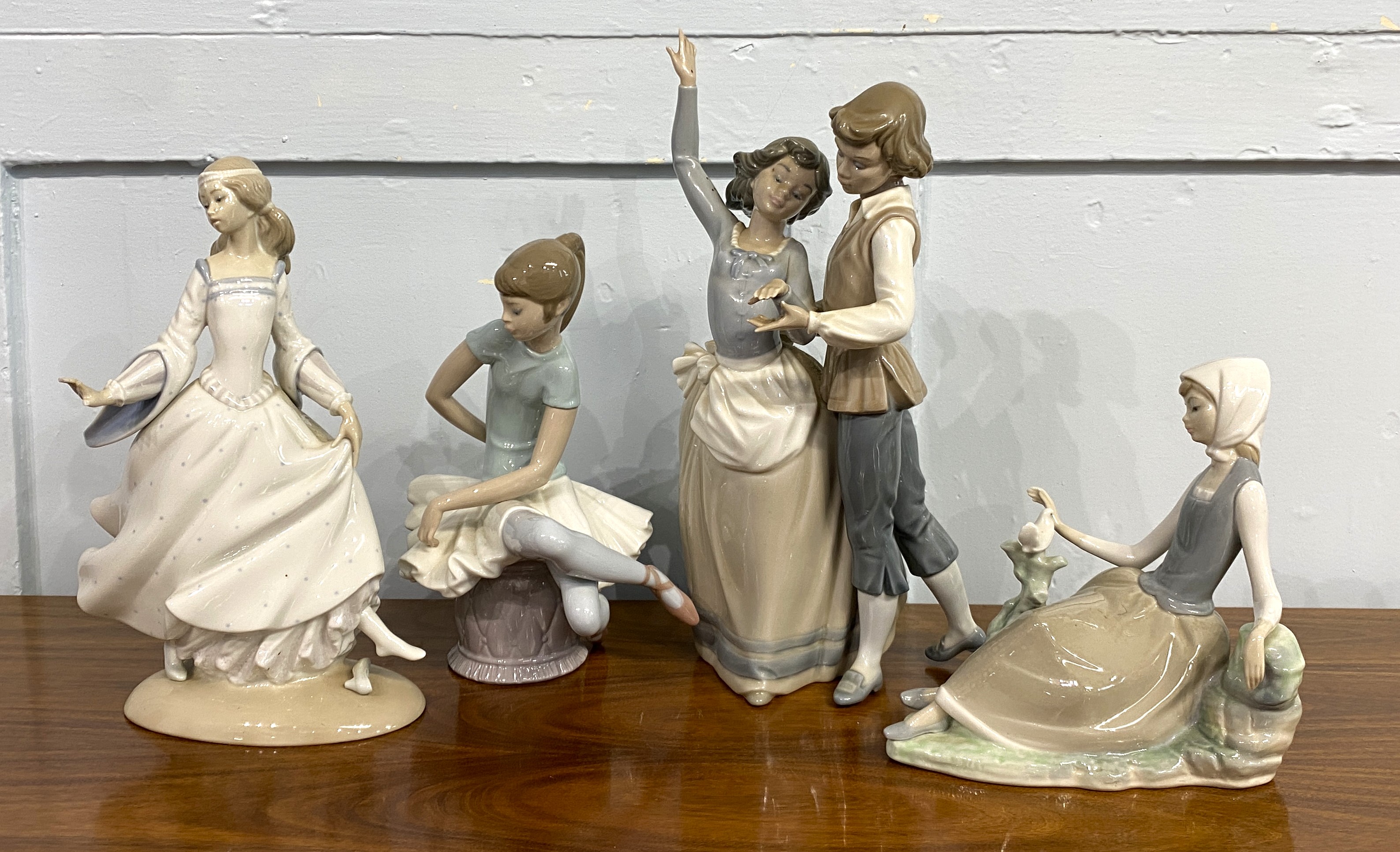 A collection of four Lladro figures, including; 'Ballet Blue', height 21.5cm, 'Shepherdess & Dove', height 16cm, 'Cinderella with Shoe', height 24.5cm and 'Folk Dancing', height 27.5cm (4)