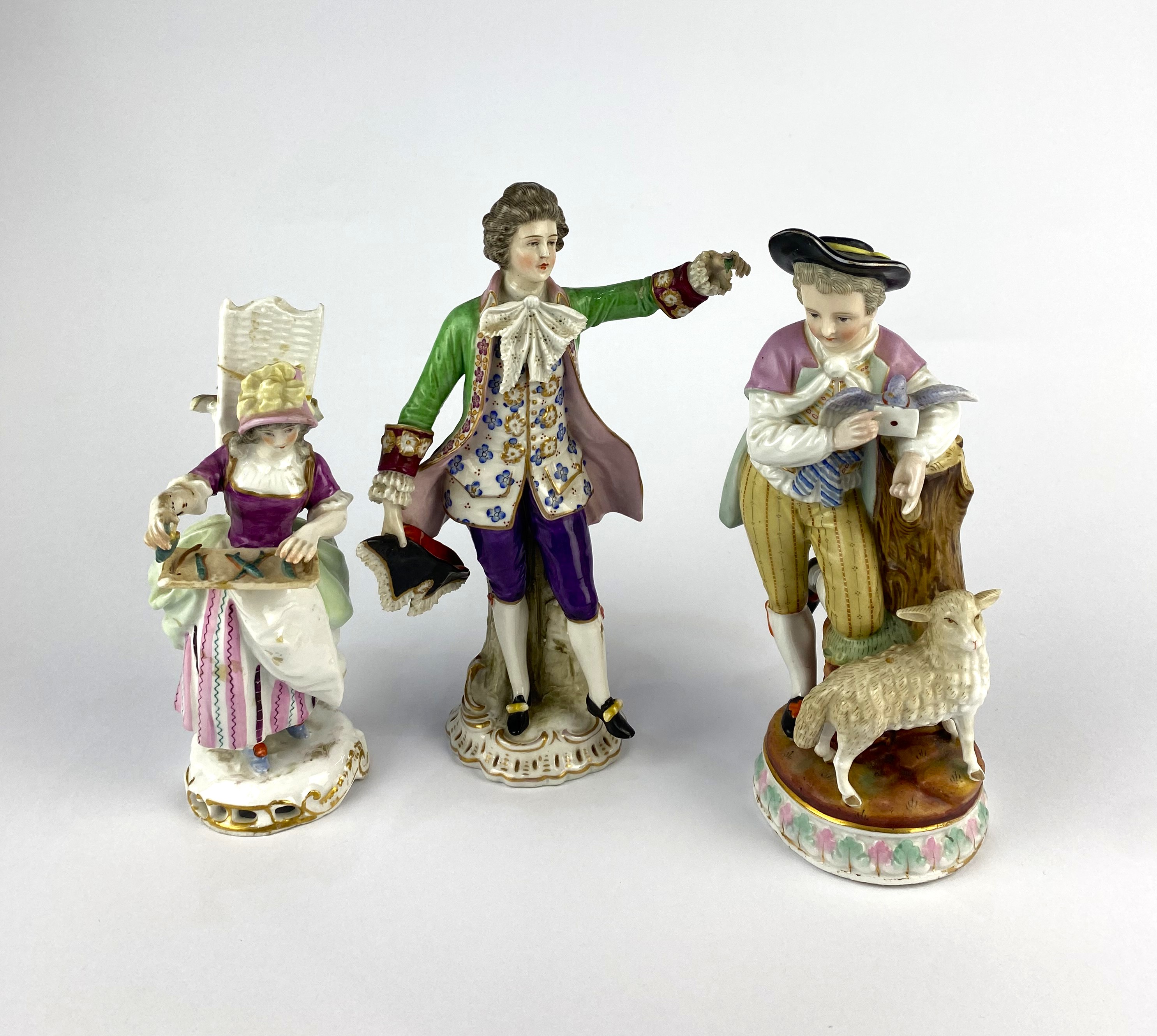 A continental porcelain figure of a standing male, 19th century, in the Sitzendorf style, modelled holding a hat with an arm aloft, wearing a floral waistcoat and green frock coat, underglaze blue mark to base (AF) height 20cm, together with a Meissen style figure of a shepherd with sheep, holding a dove with letter, underglazed blue mark to base, height 18.7cm, and a porcelain figure of a fish street seller, underglazed blue mark to base, height 17cm (AF) (3)