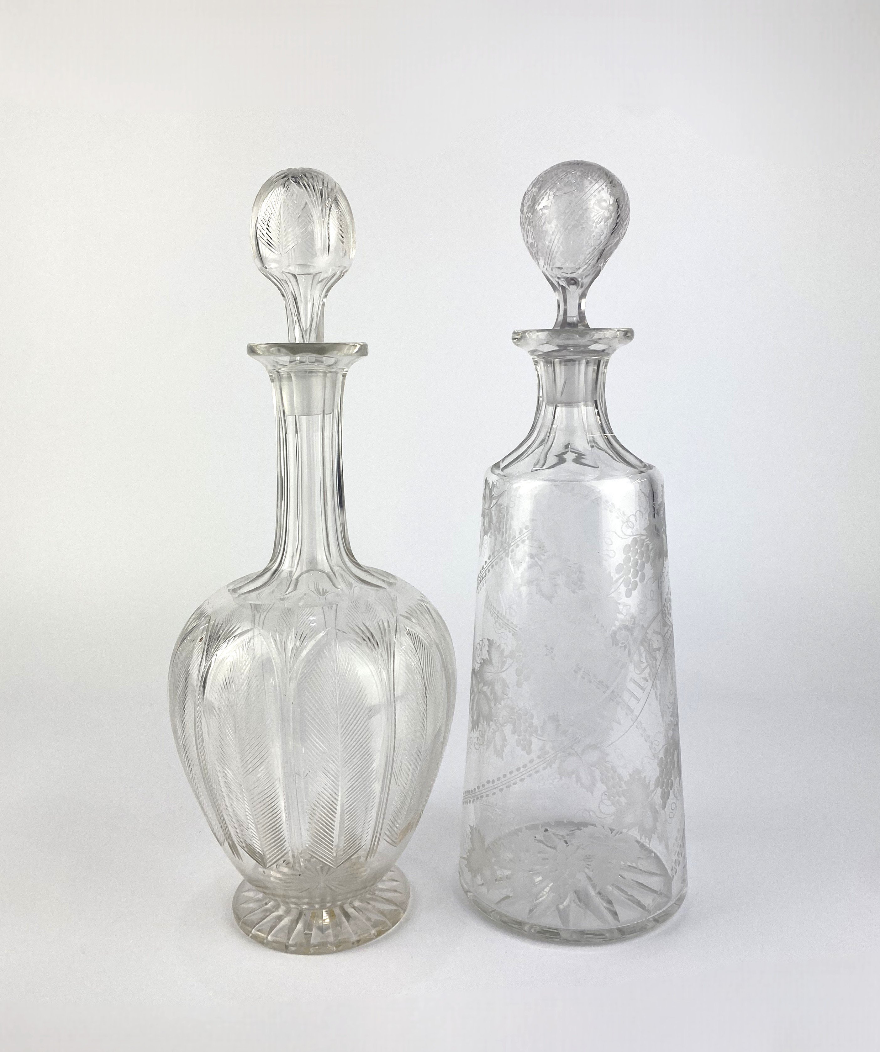 A late 19th century cut glass whisky decanter, of tapering form, engraved with grape and vine motif etched label 'Whisky', with matching stopper, height 31cm, together with a further late 19th century decanter with leaf motif, height 30.5cm (2)
