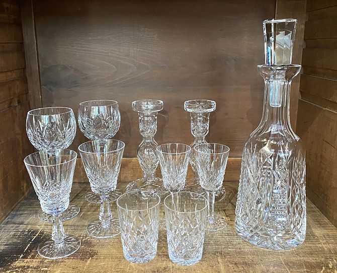 A Waterford crystal 'Clare' pattern decanter 32.5cm high, a pair of Waterford 'Lismore' hock glasses 18.7cm, a pair of Waterford 'Kenmare' crystal glasses 14.2cm, and a pair of Waterford 'Lismore' sherry glasses 13cm, together with a pair of Waterford crystal candlesticks 19cm, and two small unmarked crystal tumblers 8.4cm high