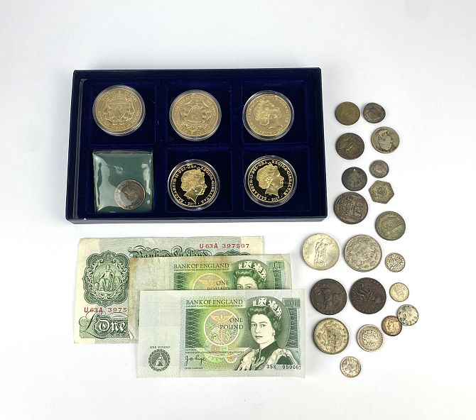 A group of coins comprising an Anne shilling 1711, a Victoria young head sixpence 1887, five gilt crown sized coins, twenty further coins and three one pound notes