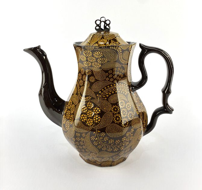 A 19th century teapot with yellow paisley design on brown ground and metal finial, unmarked, probably Scott Brothers Southwick Pottery, 23.5cm high