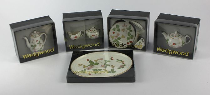 A Wedgwood 'Wild Strawberry' porcelain miniature part tea and coffee set with boxes (5)