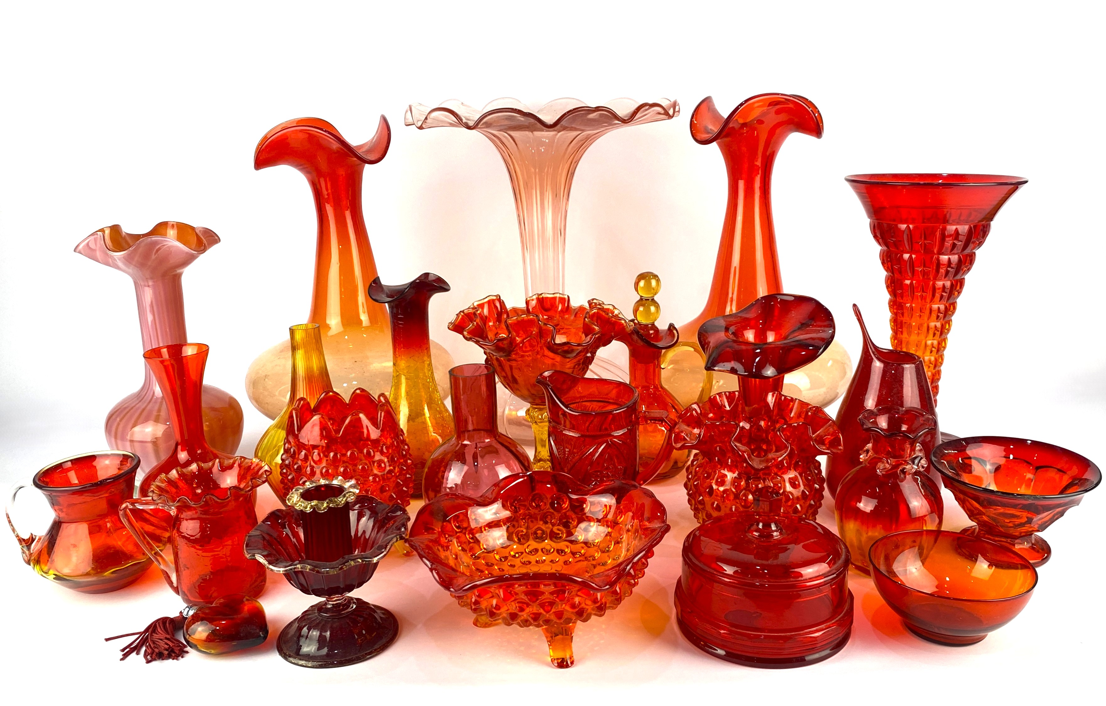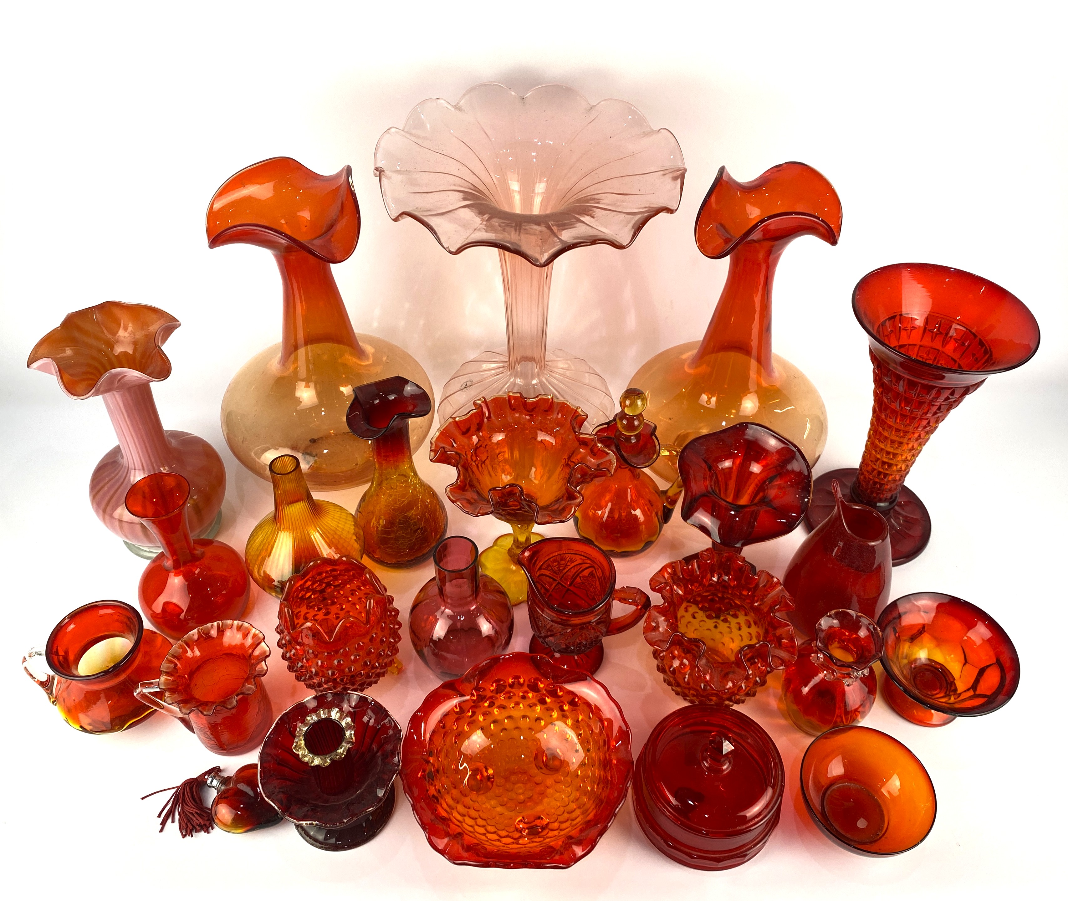 A large collection of cranberry and ruby glass, mostly late 19th and early 20th century, approximately 25 items, tallest 32cm high, (a quantity).