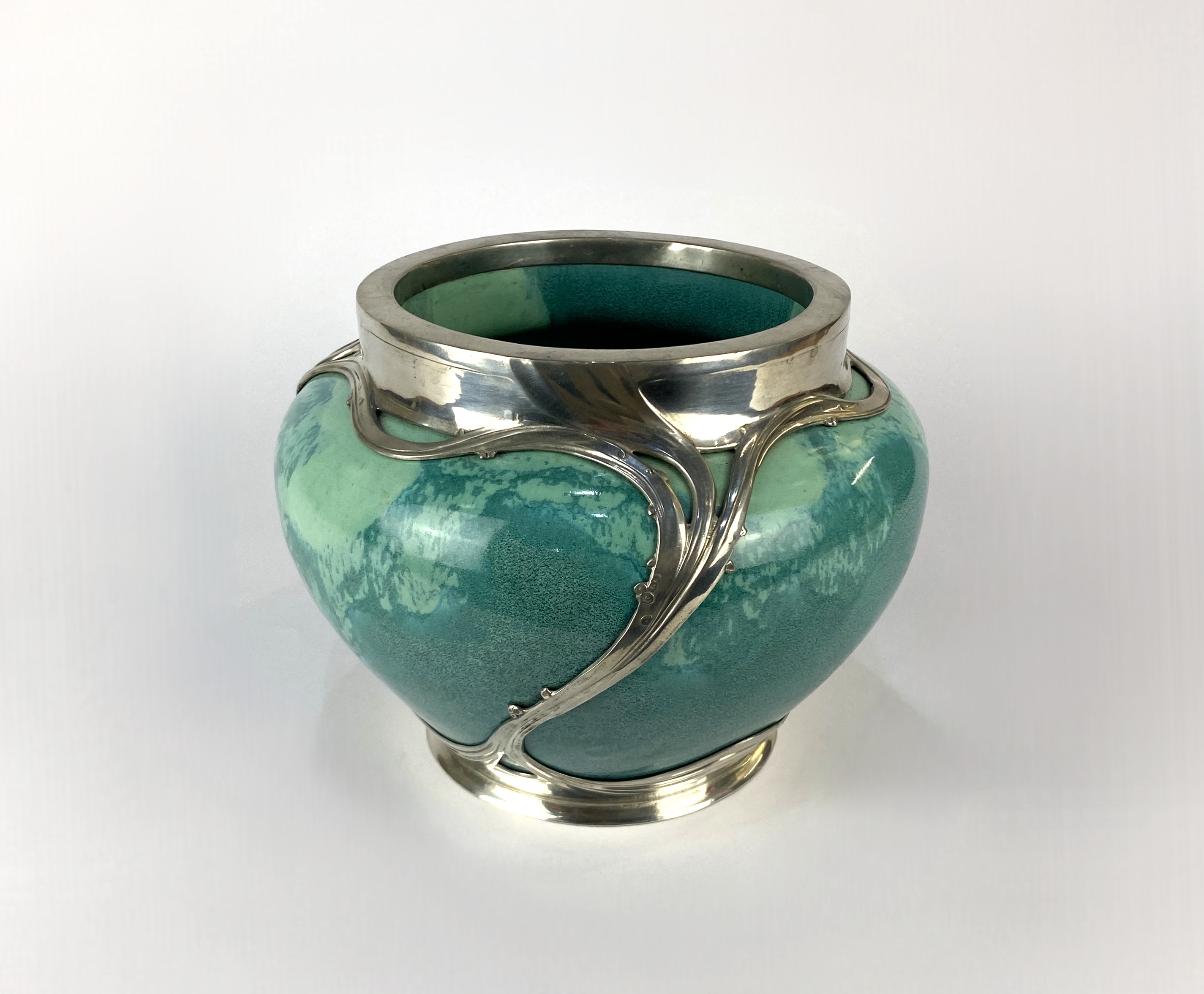 An Orivit Jugendstil pewter mounted pottery jardiniere, with a sinuous pewter frame and turquoise glaze, marked to the base and numbered 2575, height 20cm, diameter 17.5cm