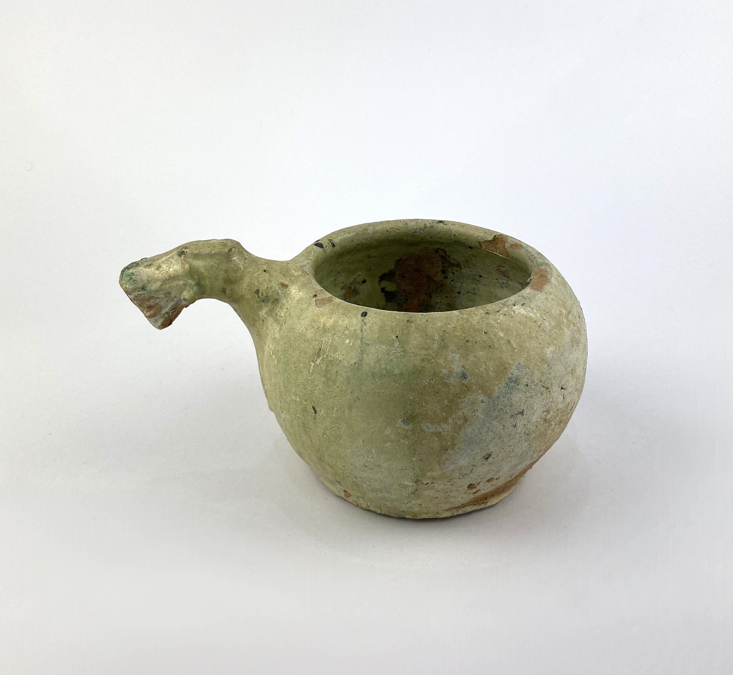 An early Asian glazed pottery bowl with dragon handle, believed to be Chinese or Annamese, c.100AD, presents with ageing and patination, labels to underside, 9cm high, (af).