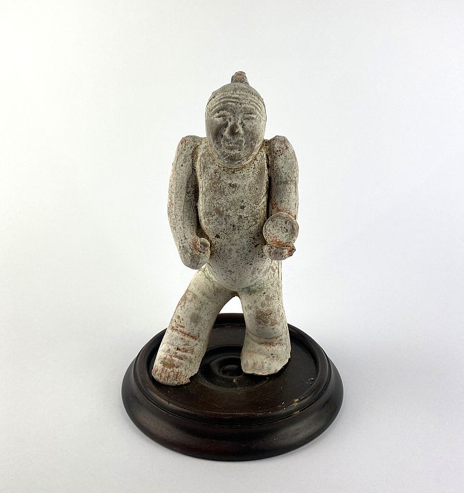 A Chinese pottery figure depicting a dwarf musician, believed to be Han Dynasty, 22cm high, (af).