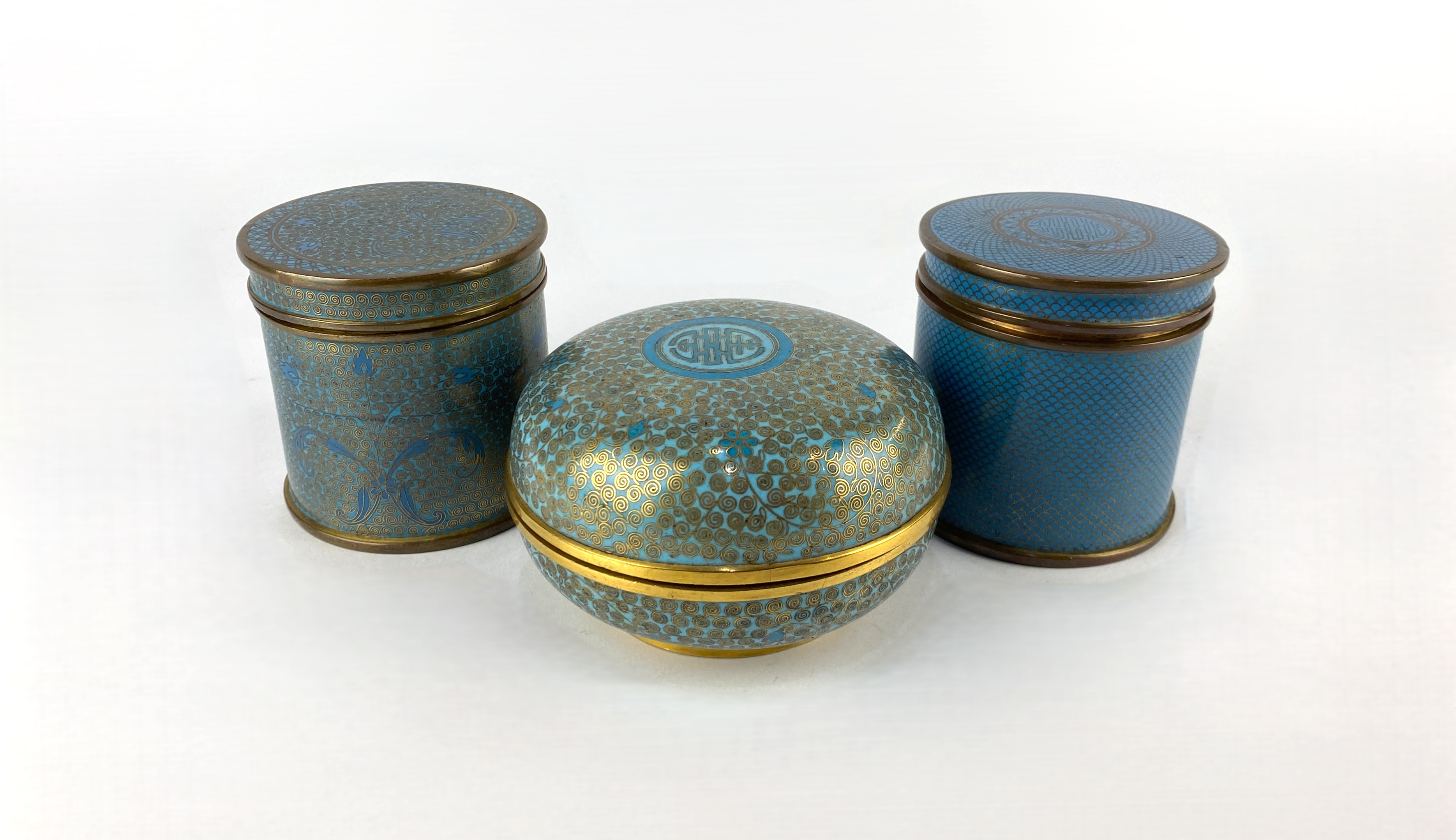 Three Chinese cloisonne enamel pots with covers, probably early / mid 20th century, 8cm, 8cm, and 7cm high, (3).