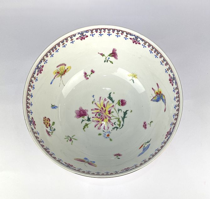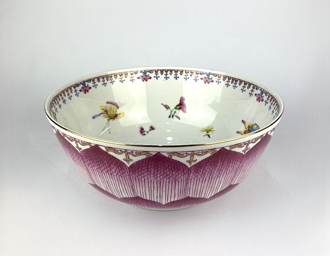 A MMA-PEM Japanese porcelain replica 'Lotus' bowl decorated with insects and flowers, gilt mark to base, 26cm diameter