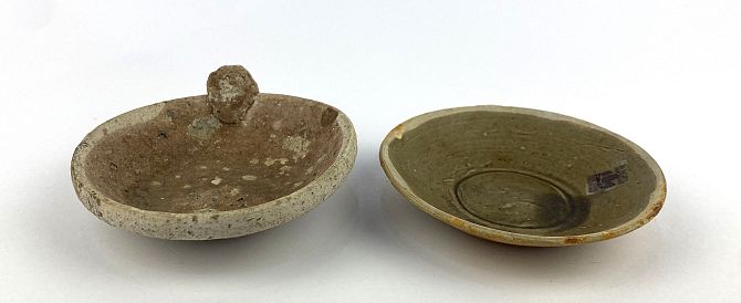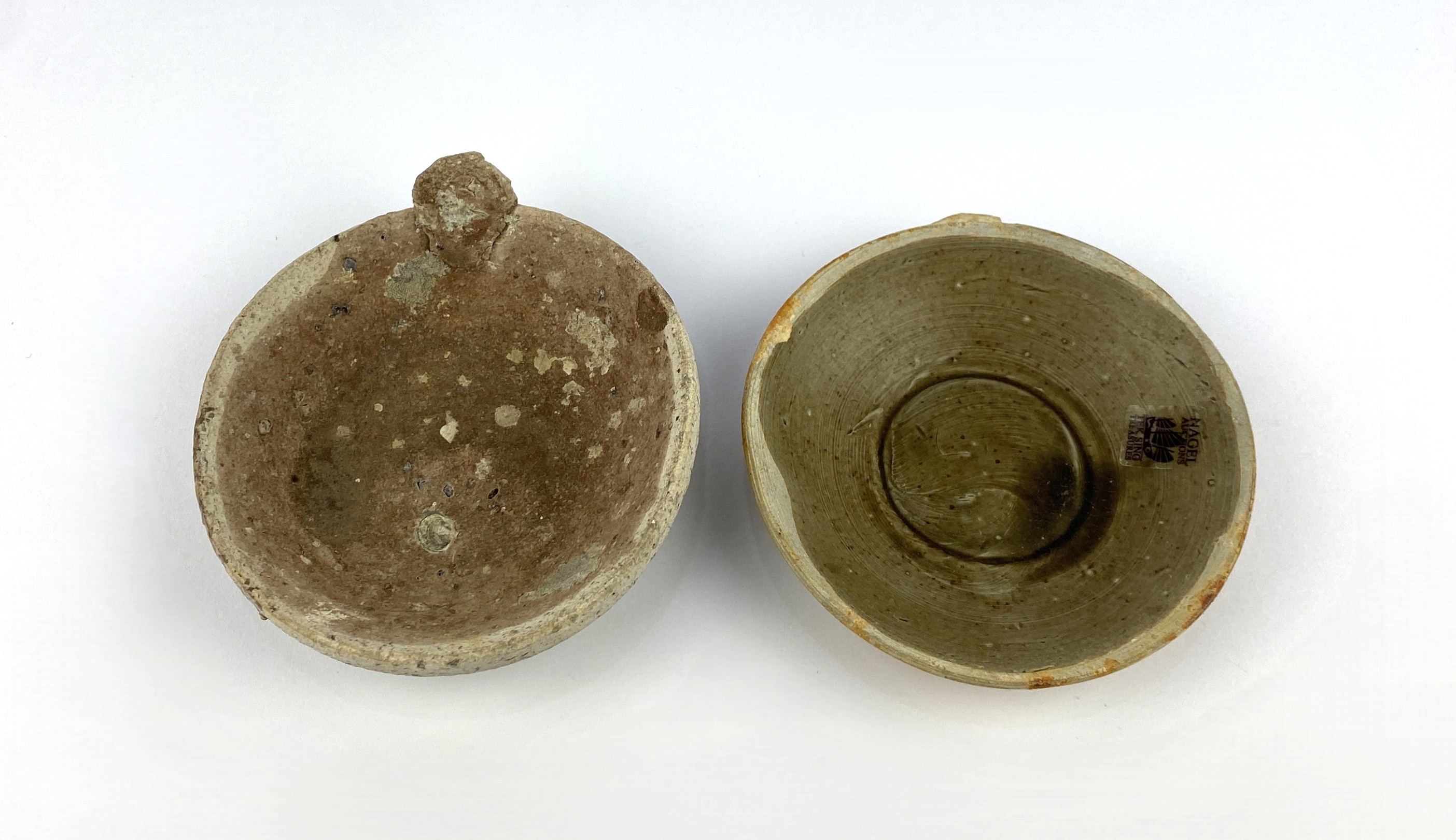 A Chinese pottery bowl from the Vung Tau Cargo, c.1690, with Christies Auctioneers label to underside, 9cm diameter. Together with an antique Chinese celadon pottery dish from the Tek Sing Cargo, with applied Nagel Auctions label, 9cm diameter, (2).