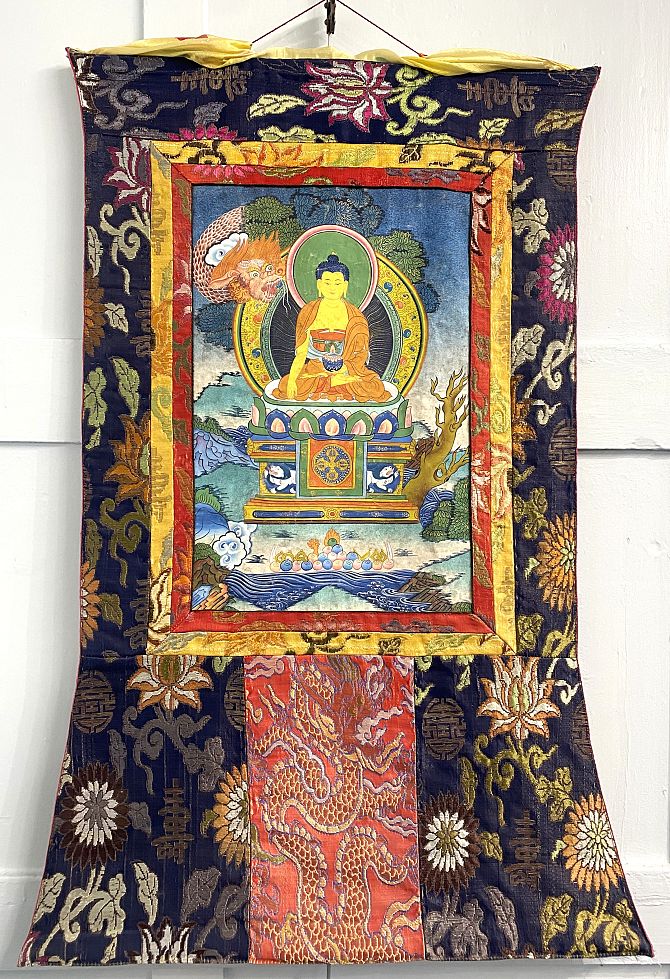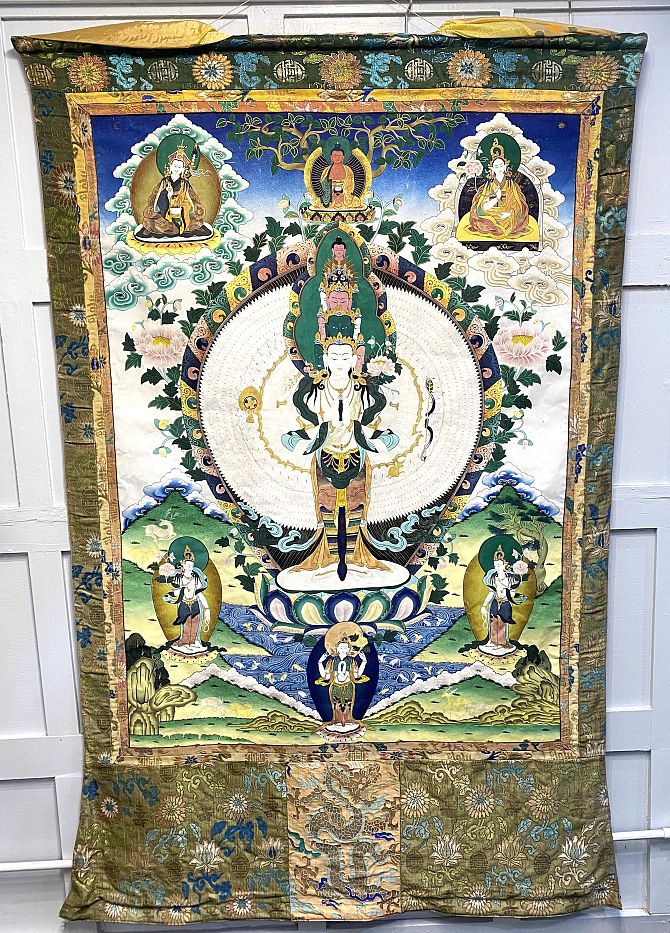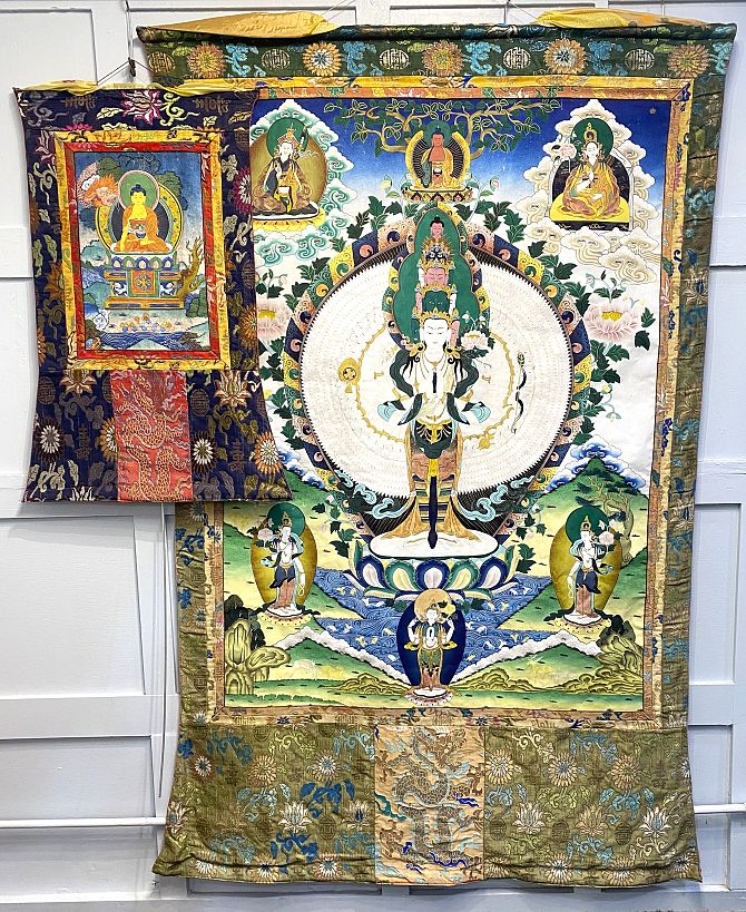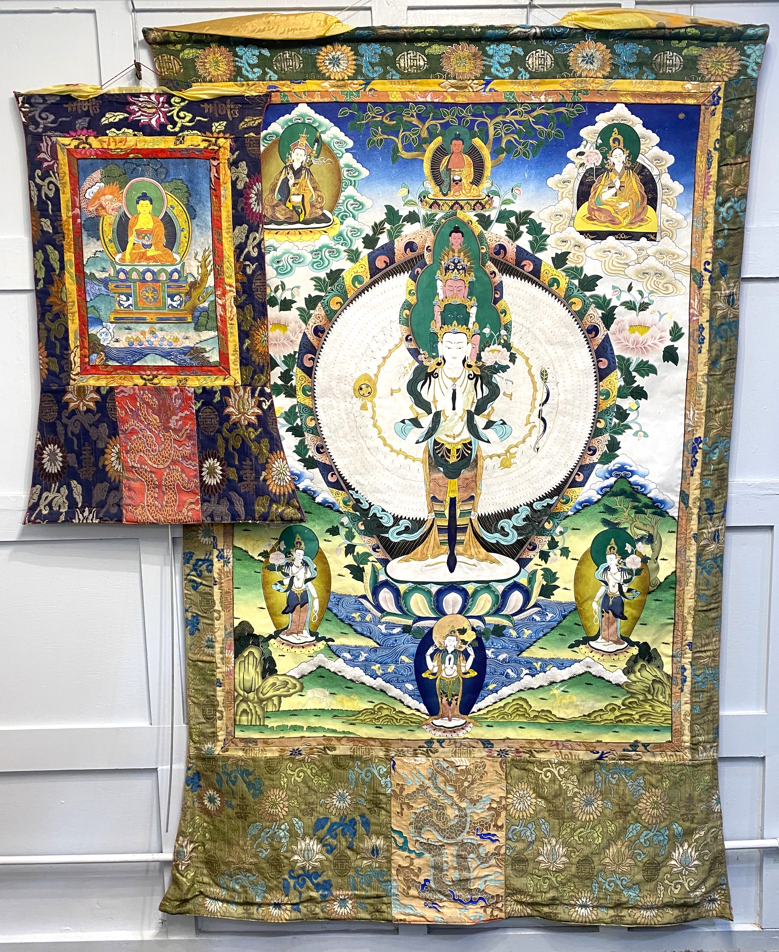 Two hand painted Thanka's, 20th century, 202cm by 125cm and 92cm by 51cm. (2)