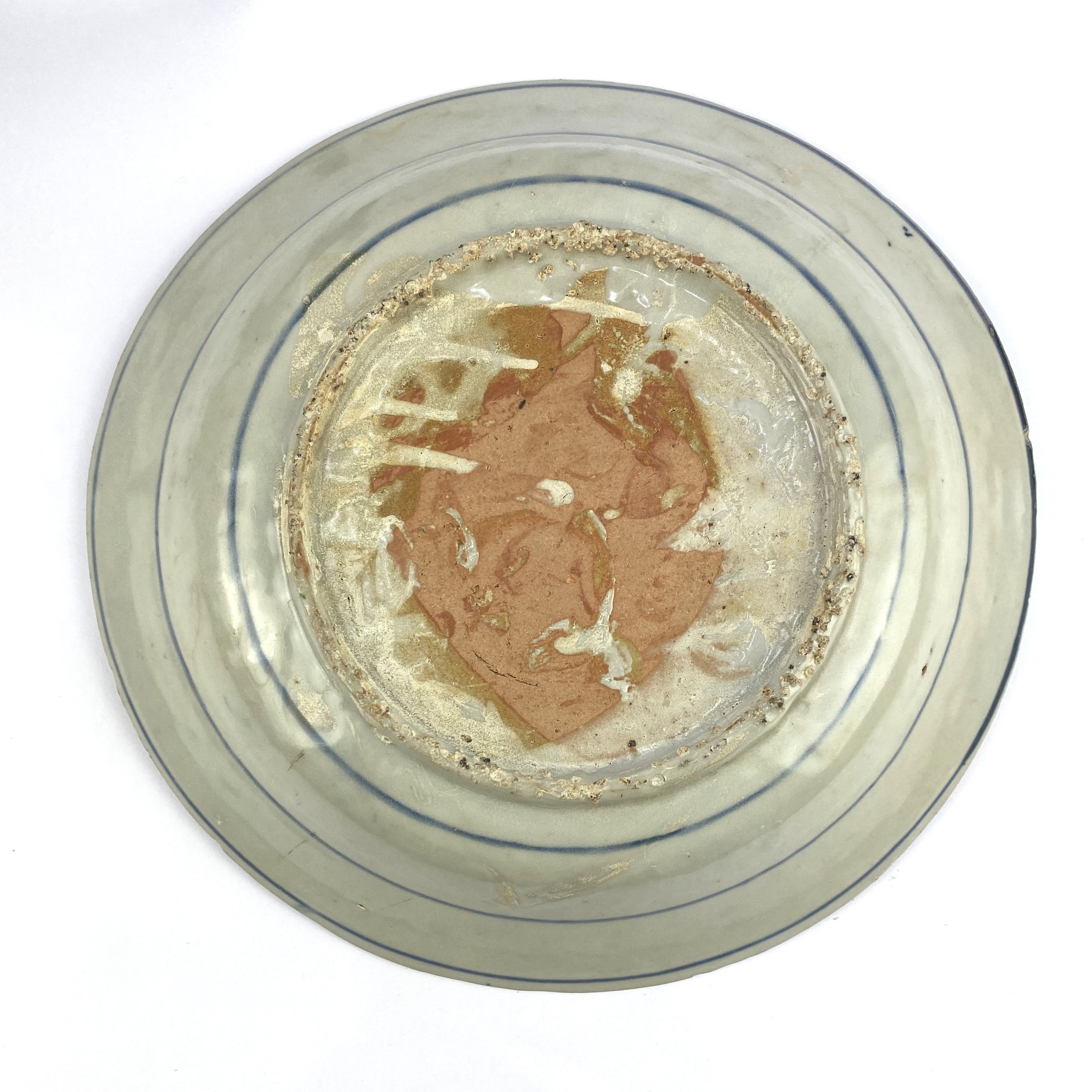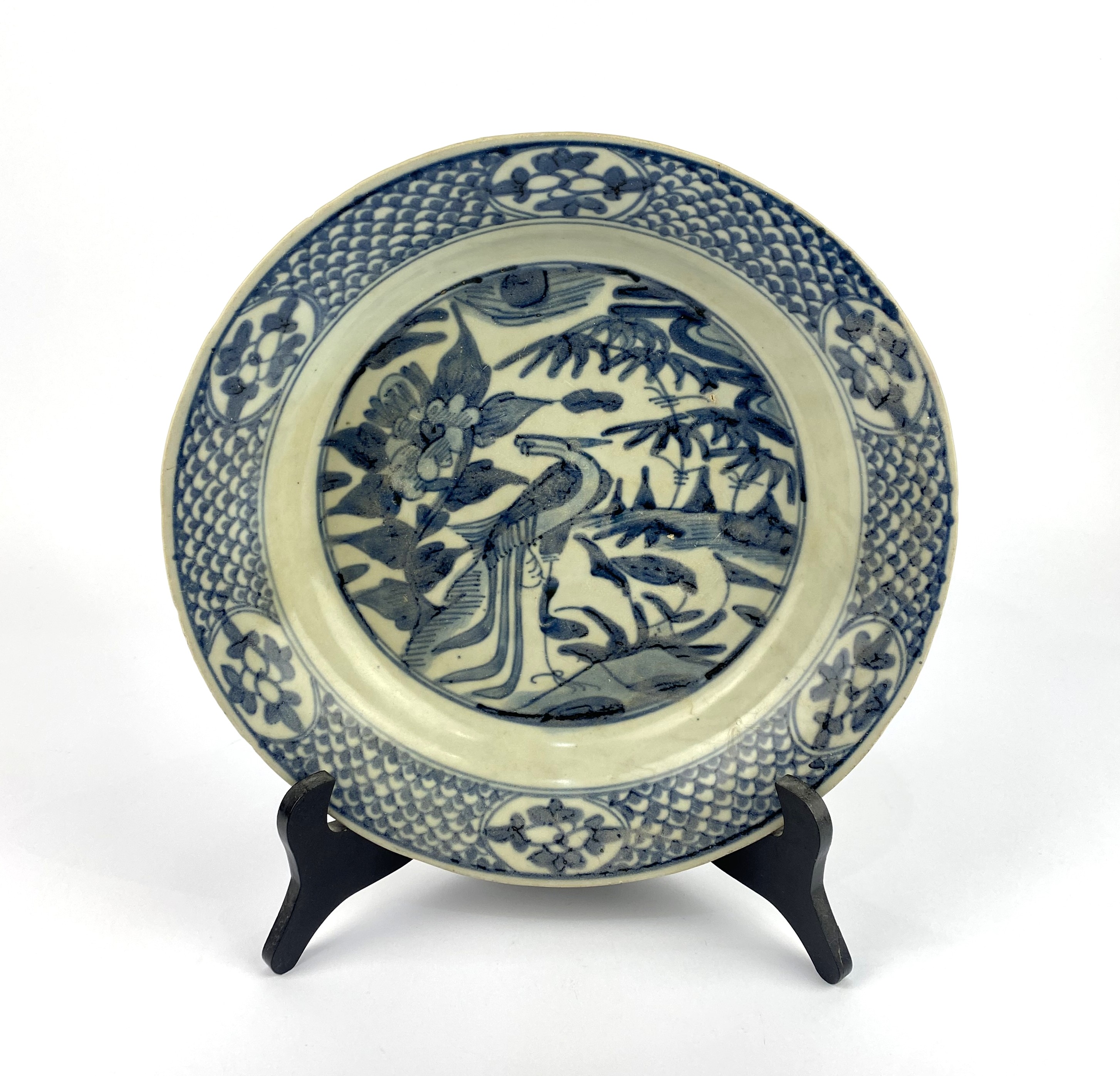 A Chinese blue and white Swatow ware dish, decorated centrally with a bird/ pheonix within a landscape, fish scale pattern rim with floral panels, diameter 29cm (AF)